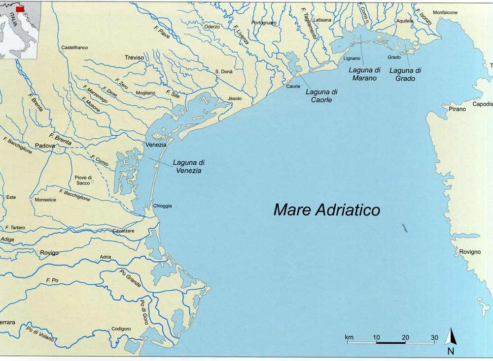 The Piave river holds a very important role in relation to the interaction between the Adriatic sea and the trans-alpine area. Its name appears quoted for the first time by Venantius Fortunatus in the sixth century (Patr. Lat. LXXXVIII, c. 62: Miscellanea, prologus) and later by the Ravenna Anonymous (Ravenna Anonymous, Cosmographia, IV, 36). The river flows out of the passes of M. Croce Carnico e M. Croce Comelico, runs through the same valley, goes through the cities of Belluno and Feltre and flows away to the coast a bit more north with respect to the Veneto lagoon Donà di Piave). Perhaps in antiquity there was a direct interaction between the Piave river and the Sile river, which indeed flows into the lagoon at the port of Piave Vecchia near to Altino and to the outlet of the Piave and has its resurgent springs in Casacorba (17km from Treviso), despite Pliny’s remark about its origins ex montibus Tarvisanis (Pliny the Elder, Naturalis Historia, III, 126). In order to explain this statement, it is possible to hypothesise that Pliny had confused the Piave river with the Sile river and had attributed to the latter the origin of the former. However this hypothesis is very unlikely. It would be more logical to assume that in antiquity there was a confluence of a Piave branch (maybe along the river Musestre) into the Sile river south of Treviso. In this way Pliny’s remark would apply. The question remains as to why Pliny does not mention the Piave river and its important outlet at all.