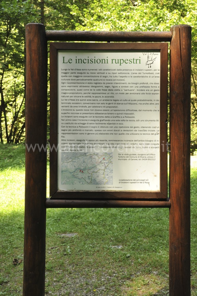 On the western side of the plateau “Altopiano dei Sette Comuni” there are many valleys. The deepest one is the Assa valley, which starts at the Vezzena pass and which tortuously heads first to the south, then to the west where it flows into the Astico valley. At the bottom of the Assa valley, along the river shore and on a rock unit of “Ammonitico Rosso”, we can see the rock engravings, the object of this visit.