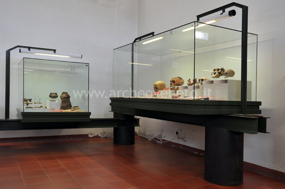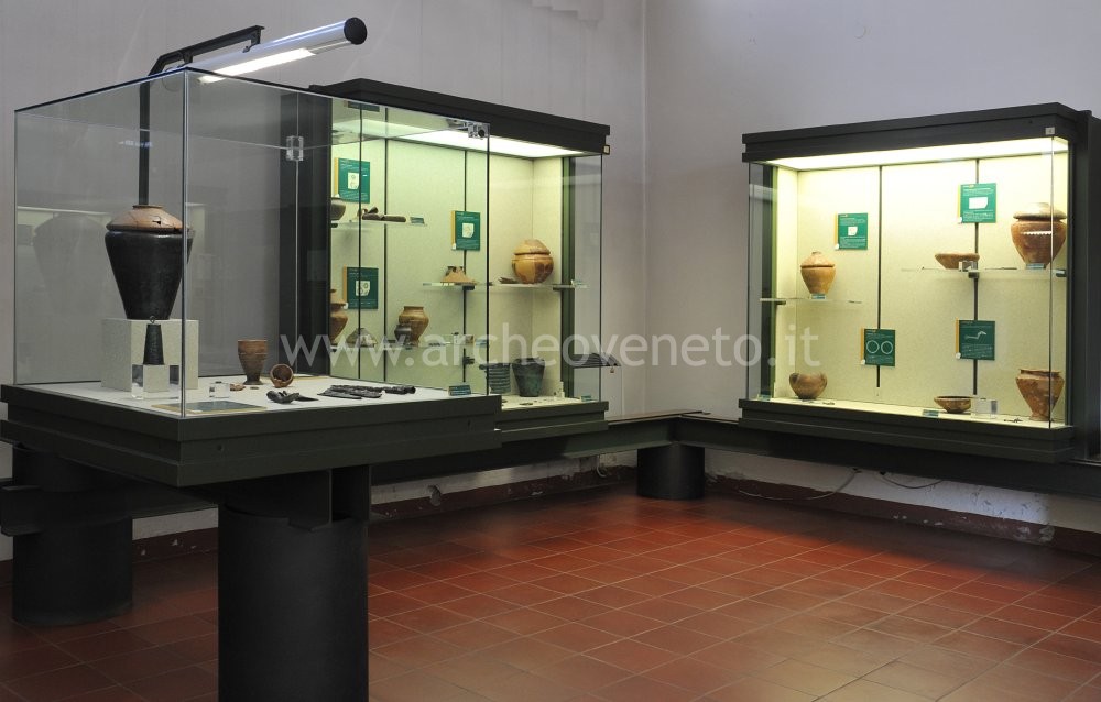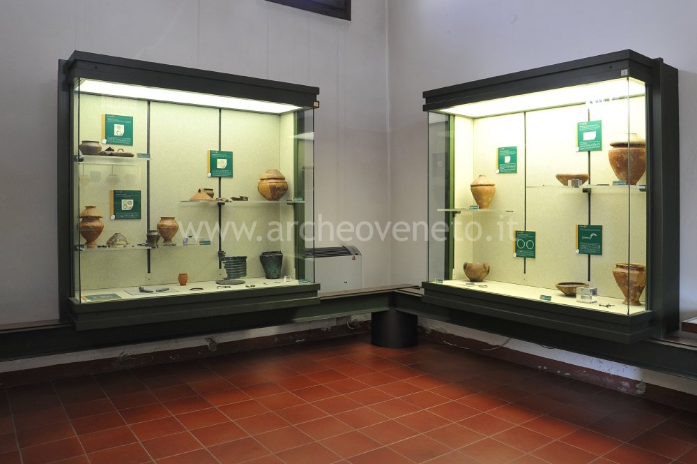 The exhibition starts from the very first stages of human evolution, which are presented thanks to the chronological seriation of the skulls of the first hominids and of their tools. Then the visit goes on showing the materials dating back to a subsequent phase of pre-history, that is Neolithic. It is possible to see examples of vases belonging to the culture of the Square Mouth Vases (first half of the 4th millennium B.C.) and to the one influenced by the tradition of the Sub-Apennines and of Chassey-Lagozza, which were found in the archaeological site of Valle San Lorenzo in Cornuda. A large amount of stone materials and numerous remains of animal bones were discovered in this area. The same display case contains other prehistoric finds discovered in the area surrounding Montebelluna, such as numerous examples of lithic industry of the late Neolithic-early Copper Age and other items dating back to the Middle and Recent Bronze Age. The rest of the room is devoted to the Iron Age (1st millennium B.C.) and to the proto-historic settlement in Montebelluna, which was placed in a strategic position, from which it could supervise the commercial relations between the centres in the plain, in the Prealps, in the Piave and in the Danube valleys. Yet most information has been provided by the studies carried out on the burial grounds of the town: the necropolis of Santa Maria in Colle and the one in Posmon.