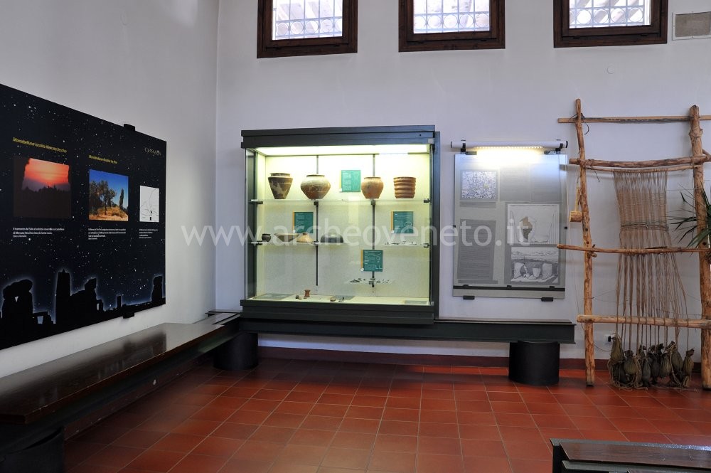 The six remaining display cases contain the grave goods discovered in the necropolis of Posmon, which date back to a time span between the late 7th cent. and the 4th cent. B.C. In the first display case, it is possible to see the grave goods of the grave nr. 62, which beside the typical ossuary vase with a bowl and a fragment of a bronze cup, contains numerous fibulae (the bow of one of them has the shape of a horse with horse rider) and those of the grave nr. 54, which display numerous objects (spindle whorls, reels, pin, belt hook) discovered inside a ceramic ossuary vase decorated with small bronze studs.