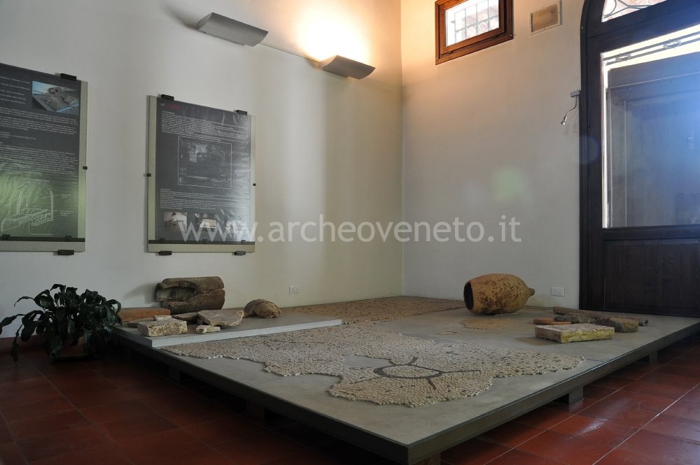 The same room contains some materials discovered in the settlements dating back to the Roman Age that were discovered in the area around Montebelluna: fictile pipes of cylindrical shape, a lead fistula, stamped tiles and bricks, amphoras, loom weights and querns. These items are placed on the bicolour mosaic of the cubiculum of a villa discovered in Santa Maria in Colle.