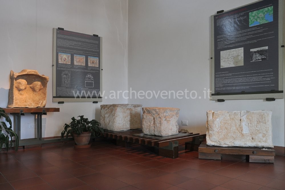 This room displays the different kinds of burial used in the Roman age in Montebelluna and its surroundings. There are two quadrangular urns with central hollow for the deposit of the ashes (1st cent. A.D.), an aedicule-shaped stele with the busts of the two departed wearing mantle and tunic (1st cent. A.D.) and the reproductions of a burial in a cut and horizontally laid amphora and of a capuchin-type grave (burial covered with tiles in a double pitch roof that provided an empty space in which the corpses rested). The majority of these funerary artefacts come from the necropolises of Santa Maria in Colle and Posmon, which have been used throughout the centuries from the Iron Age till the end of the Roman Age.