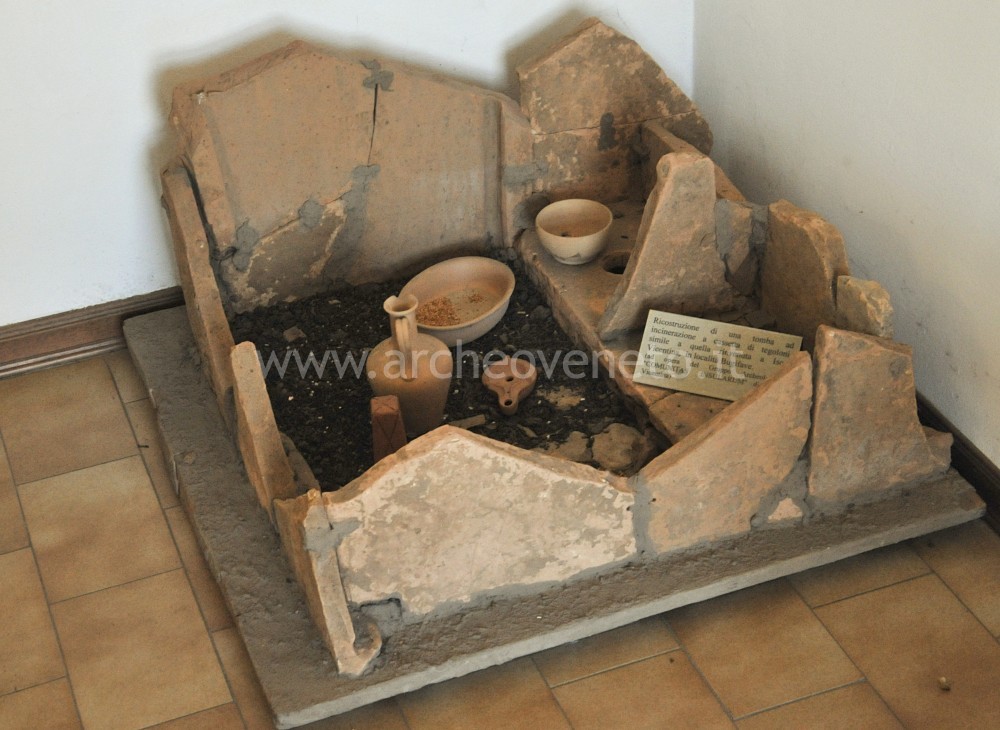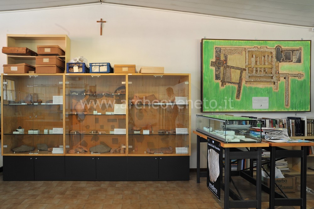 In the small entrance room, there are now the didactic reconstruction of a cist cremation burial and a copy of the well-known stele of Isola Vicentina, kept in the Naturalistic Archaeological Museum of Santa Corona in Vicenza which is the first and so far the only epigraphic example in Venetic language containing the ethnic name of the Ancient Venetians (Venetkens).