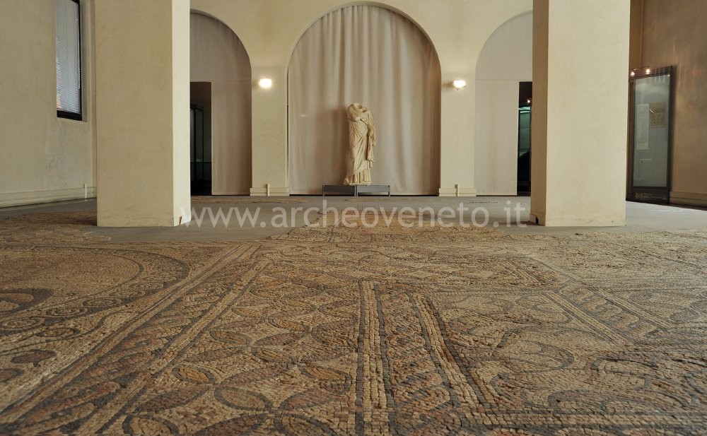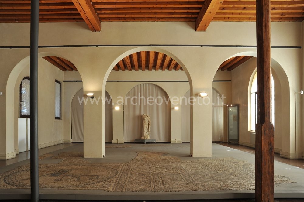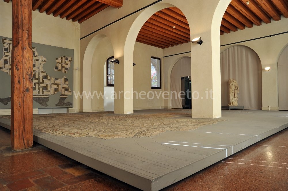 At the entrance of this room there is a scale model of a Roman domus with atrium and tablinum, a typology of domus known especially thanks to the digs in Pompeii and Ercolano. Two large mosaic floors cover most of the room. The first geometric and dichromatic mosaic (black rectangles on a white background around a black central square) placed on the right wall was discovered near the cryptoporticus (vegetable gardens of the bishop’s palace) and probably belonged to a domus. The second mosaic, found in Piazza Biade, combines highly interwoven patterns around squared panels with figured decorations depicting scenes of hunting and fights between heroes and animals. The iconography of a victorious warrior (fight between Bellerophontes and the Chimera) is probably depicted in the central panel.