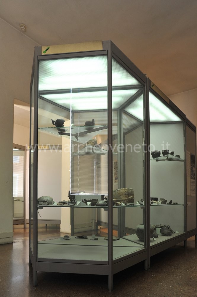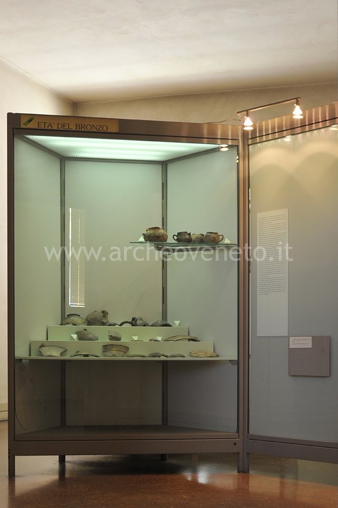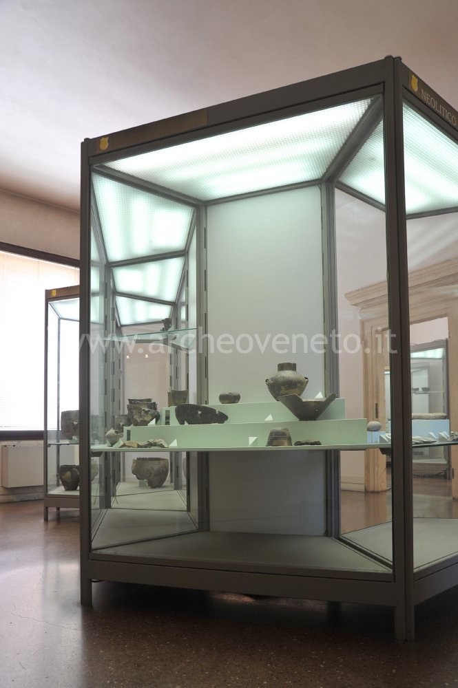 The display case contains fragments of square mouth vases decorated with engravings and graffiti, cylindrical loom counterweights, stone axes, decorated spindle whorls and flint tools from Villa del Ferro-Val Liona, Valli di Fimon and Arcugnano.