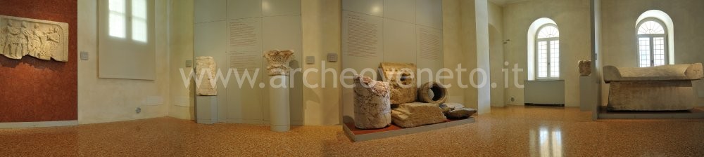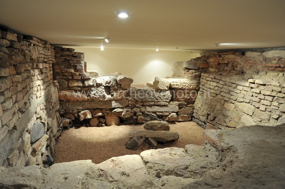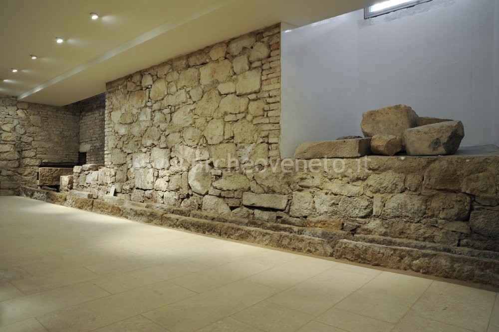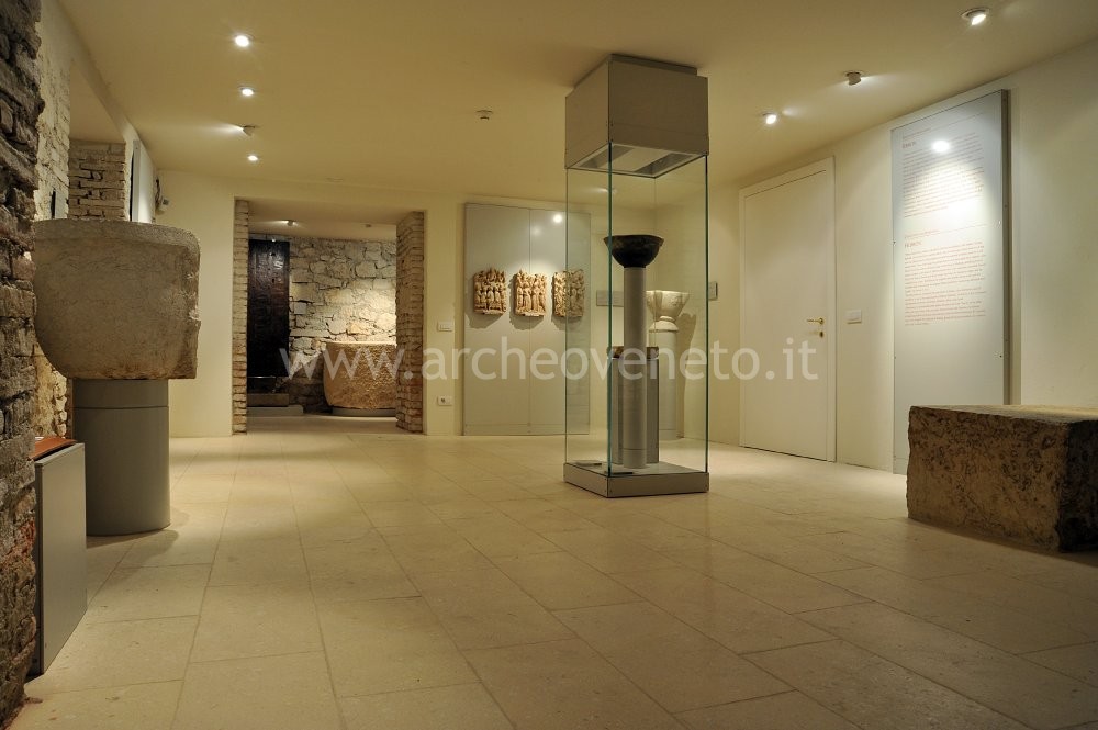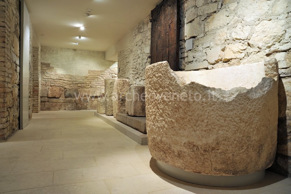 The basement of the Bishop’s Palace hosts the foundation of a defence tower with quadrangular base of the early Middle Ages (4 x 4 m) and a stretch of a trachyte water pipe dating back to late Antiquity. Next to these items, which were found on site, there also some architectural fragments of the Roman period made of stone from Istria, stone from Vicenza and trachyte, which were discovered during the excavation carried out near the medieval tower between 1946 and 1953. Close to them, it is possible to see a large basin made of stone from Vicenza and dating back to Late Antiquity, which was discovered during the same excavation campaign.