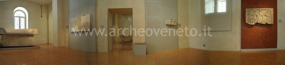 The first room on the ground floor displays numerous finds that provide information on the appearance and the consolidation of the Christian religion in Vicenza and the surrounding area. A panel explains the history of the municipium of Vicetia, which developed along the main road (via Postumia) and which was enriched with numerous monuments between the 1st cent. B.C. and the 1st cent. A.D. Below the panel, it is possible to see some architectural and structural fragments of Roman origin discovered between 1946 and 1953 in the diocese: trachyte flagstones from a paved road surface; a stretch of a trachyte water pipe; fragments of a cornice in Vicenza stone and a part of a column shaft in Chio marble. The second section of the room is devoted to the finds discovered during the excavation carried out in the area around the Cathedral, where the first church of the city was probably located, which can be traced back to the first half of the 5th century. The presence of an early Christian settlement in the area is confirmed by the discovery of a small stone pillar with a kantharos and a cross engraved; fragments of a polychrome geometric floor mosaic and a few remains of wall structures. The last section of the room displays the stone material discovered in the extra-urban burial ground, on one side of via Postumia, which was linked to the Church of Saints Felice and Fortunato. Particularly noteworthy is the right side of a sarcophagus dating back to the 4th cent., which depicts the adoration of the Magi, thus being the first Christian iconographic representation in Vicenza. Also the impressive coffin-like sarcophagus (5th cent.), another fragment of sarcophagus with the monogram of Christ (5th cent.) and a pluteus with a kantharos between two lambs (6th cent.) were discovered in the same area.