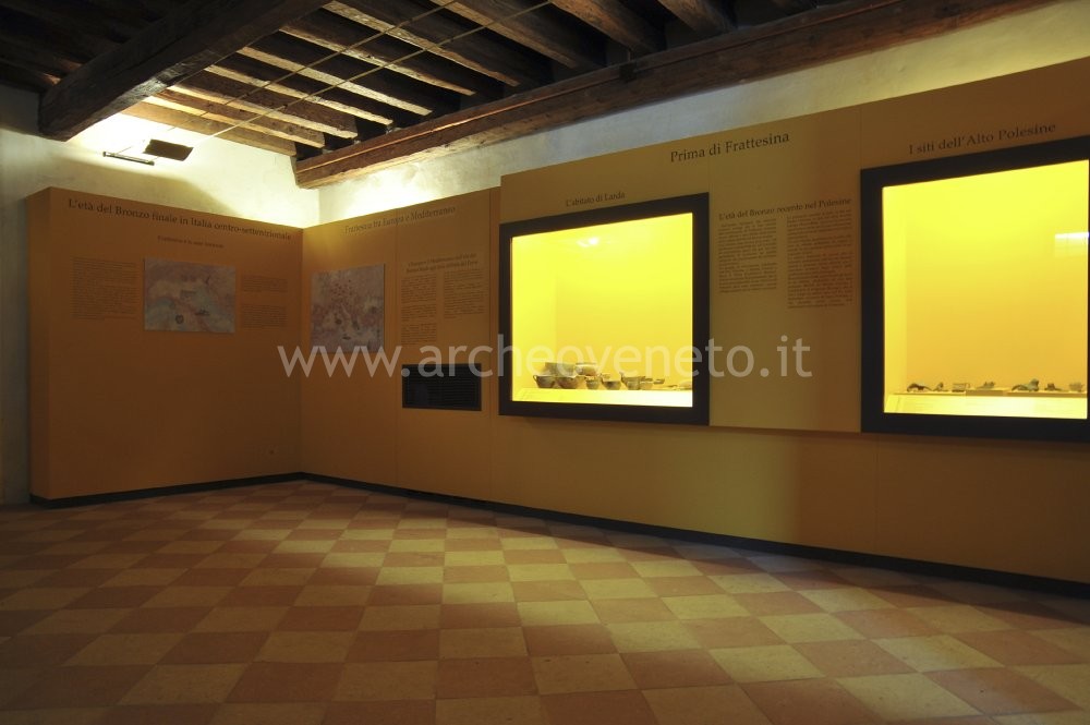 Il tema della prima sala riguarda il territorio polesano prima di Frattesina. Il quadro del popolamento è ancora incompleto e gli abitati sembrano piuttosto radi. Un altro tema trattato è l’insediamento di Frattesina nel contesto europeo e italiano. Infine, si accenna all’antica idrografia della pianura e all’antico ambiente naturale del Polesine.