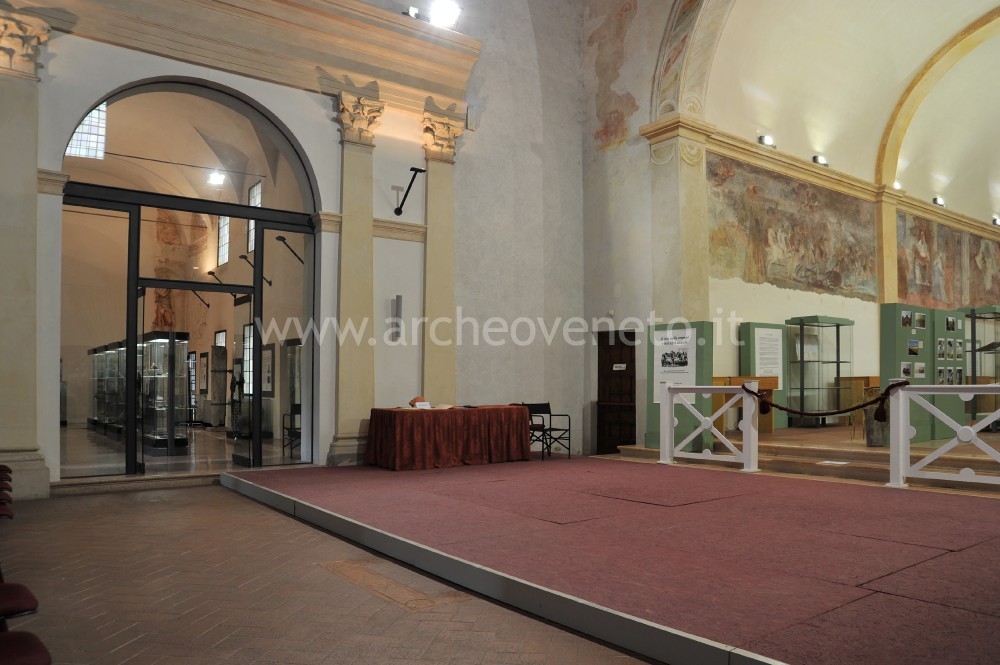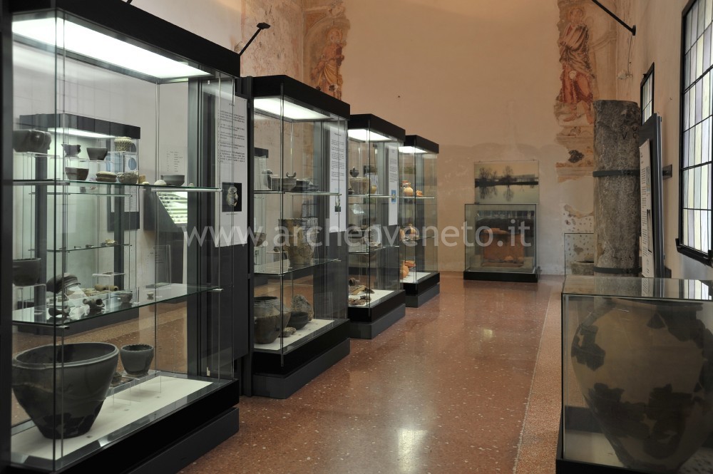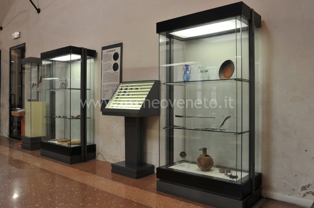 La presenza romana nell’antico territorio di Isola della Scala è testimoniata dalla necropoli della Pellegrina e dal miliare di Massenzio. Quest’ultimo, ritrovato in località Falceri, attesta che in quest’area doveva passare una delle più importanti arterie del Nord Italia, la via consolare Claudia Augusta Padana, stesa in epoca giulio-claudia e ristrutturata, nella tarda antichità, dall’imperatore Massenzio (306-312 d.C.). La maggior parte dei reperti di epoca romana provengono dalla torbiera di S. Carlo della Pellegrina e vennero alla luce in occasione dei lavori di scavo effettuati nel 1989 e di un successivo intervento di esplorazione subacquea, che permise di accertare la presenza di una necropoli del I sec. d.C. Le tipologie tombali erano principalmente due, riproposte all’interno del Museo: ad anfora segata o entro cassette composte da tegole. I corredi, esposti all’interno delle due vetrine successive, comprendevano vario vasellame ceramico (olle in ceramica comune verniciata, coppe in ceramica a pasta grigia, coppette, brocche e un piatto in terra sigillata con bollo), lucerne, fibule in bronzo, contenitori in vetro (un’anfora in vetro blu, una coppa con parte di ansa tortile, balsamari) e utensili in bronzo (roncole, un coltello e un falcetto).