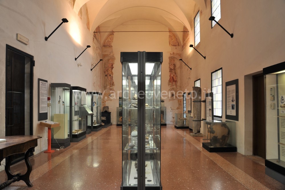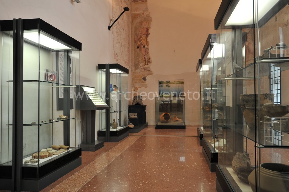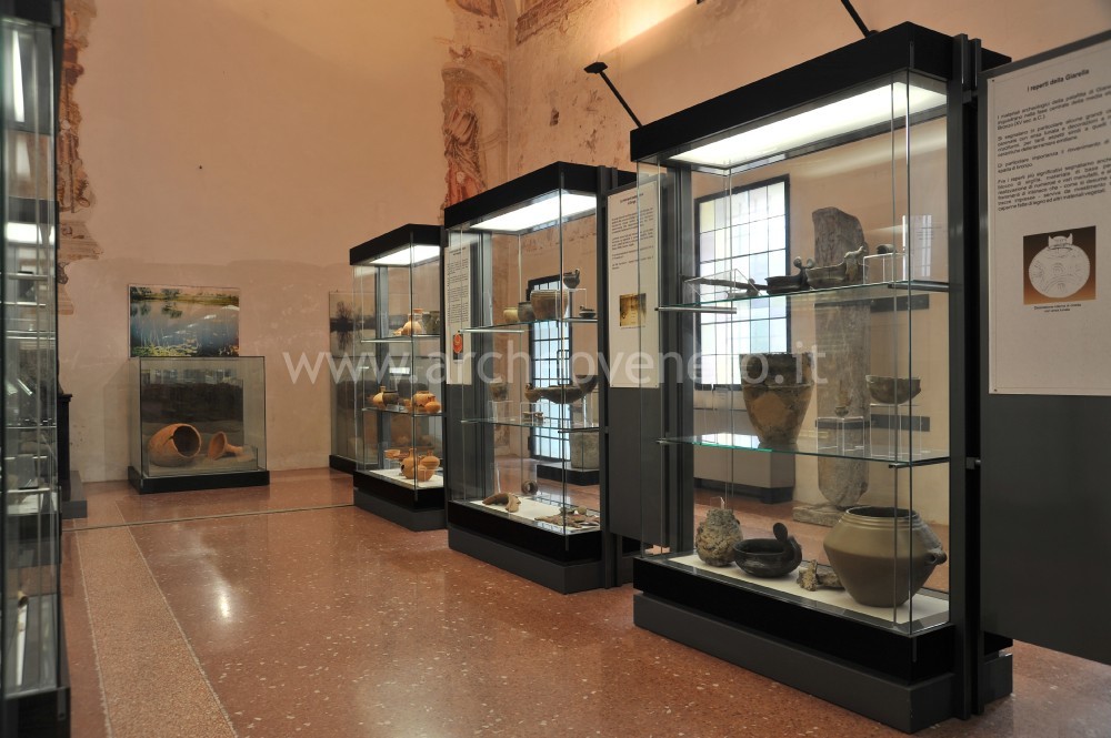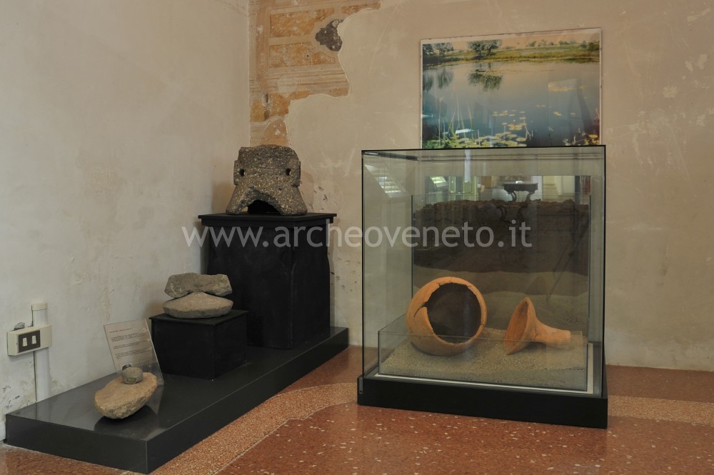Il percorso museale inizia con i rinvenimenti dell’età del Rame (seconda metà del III millennio a.C.): punte di freccia, un’accetta levigata da Tarmassia e una lama di pugnale in selce da Giarella. Il maggior numero di testimonianze preistoriche rinvenute nella pianura veronese è però ascrivibile all’arco cronologico compreso tra il Bronzo Medio (XVIII-XVI sec. a.C.) e il Bronzo Recente (XIII sec. a.C.)-Finale (XII-X sec. a.C.). Gli insediamenti di questo periodo si trovavano ai margini delle depressioni entro cui scorrono i fiumi Tartaro e Tione ed erano costruiti su palizzate lignee. All’interno della prima vetrina i reperti appartenenti al Bronzo Antico sono quelli provenienti da Cà Magre; tra questi ricordiamo tre tazze, di cui una ansata, un frammento di vaso con decorazione incisa e un peso. Al Bronzo Medio appartengono un peso, un’accetta in pietra levigata, un’ascia in bronzo, uno scalpello in bronzo, frammenti di pettine in osso, vasetti in miniatura e un cucchiaio per fusione, tutti rinvenuti nella località di Trevenzuolo. Il Bronzo Recente è rappresentato dai materiali provenienti da Corte Vivaro, tra i quali menzioniamo una figurina fittile zoomorfa, alcune accette in pietra levigata, un fodero, una tazza, un’ansa lunata, alcuni pesi, un corno di cervo lavorato e una piastra di terracotta forata.
