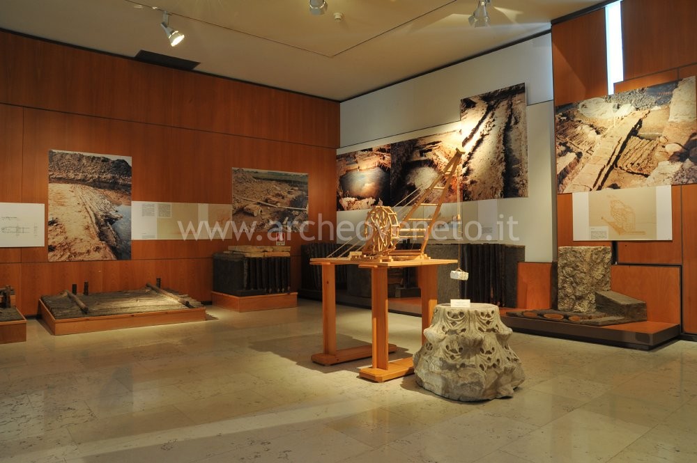 Sulla sinistra della sala, nel primo ambiente, sono presentate varie ricostruzioni dei sistemi di controllo delle acque, che l’uomo cominciò ad utilizzare già nelle prime fasi di occupazione dell’area (fase preromana) e che gli hanno permesso l’integrazione con il contesto ambientale: un sistema di captazione idrica con sifone galleggiante, uno scalo di alaggio, due opere di rosta e diverse modalità di palificazione. Al centro dello stesso ambiente si distinguono un modellino ricostruttivo di una macchina per il sollevamento di blocchi architettonici di età romana, un capitello corinzio del VI sec. d.C. e un blocco in trachite con fregio di danzatrici dalla località Cà Bianca (epoca tardo-imperiale). Accanto alle ricostruzioni si trova una vetrina che espone lucerne, vasi (un fondo di coppa in ceramica sigillata nord-italica, una coppa in ceramica a pareti sottili e un manico di tegame in ceramica comune), pesi da telaio (sia troncopiramidali che circolari), tegole bollate, lacerti di mosaico e reperti anforacei di età romana, provenienti da collezioni private e dai ritrovamenti subacquei.