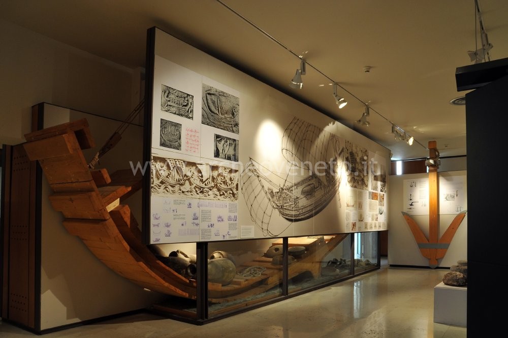 L’ultima parte della sala è deputata ad ospitare una splendida ricostruzione in scala reale dello spaccato di un relitto di nave oneraria romana del I sec. d.C. All’interno è esposto ciò che è stato recuperato in mare e in laguna dal Club Subacqueo San Marco e che probabilmente componeva il carico del relitto: macine di grano in trachite, anfore da trasporto, un mortaio in terracotta e ceppi di ancore. Affiancano questa notevole riproduzione un pannello, che illustra i sistemi di navigazione in uso a quell’epoca, tre pesi in pietra di età romana e la ricostruzione di un’ancora romana con accanto alcune componenti originarie della stessa (i ceppi).