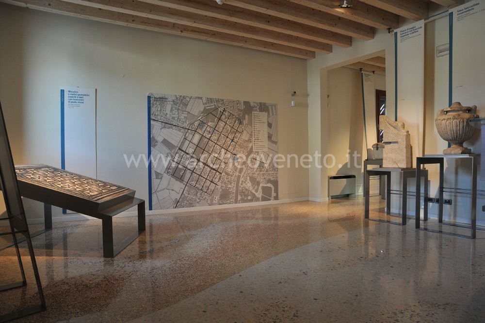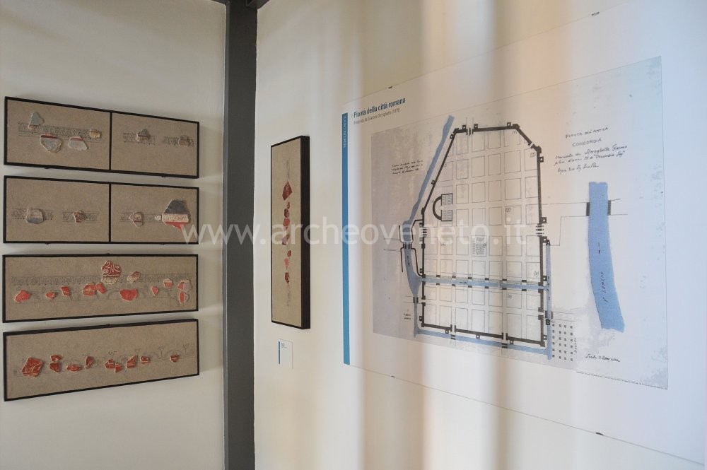 Appena entrati nella sala al piano terra si incontra una grande pianta, che illustra i principali rinvenimenti archeologici della colonia di Iulia Concordia e permette al visitatore di focalizzare le aree in cui, ancora oggi, sono visibili gli importanti resti della città romana. Accanto a questa pianta sono presenti il mosaico bicromo a motivi geometrici scoperto in una domus nell’area sud-occidentale dell’antico abitato (I sec d.C.), un fianco di seggio funerario con bracciolo sagomato a delfino proveniente dalla necropoli occidentale, località Levada (I sec. d.C.) e un vaso baccellato ornamentale dalla necropoli in località San Giacomo (I sec. d.C.).