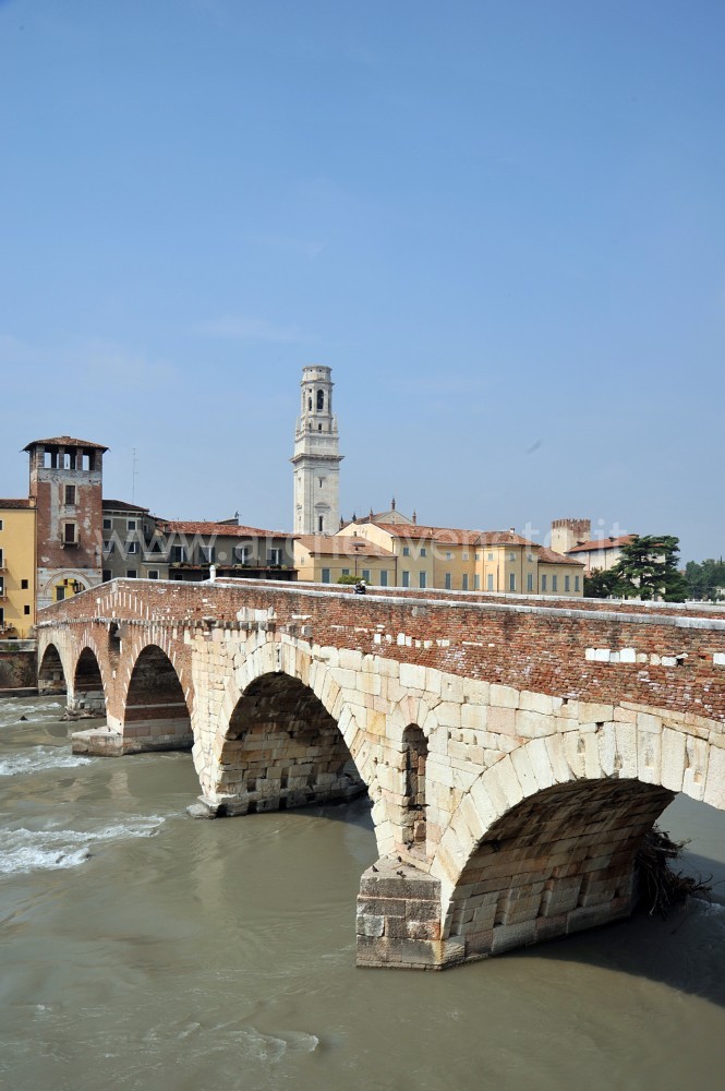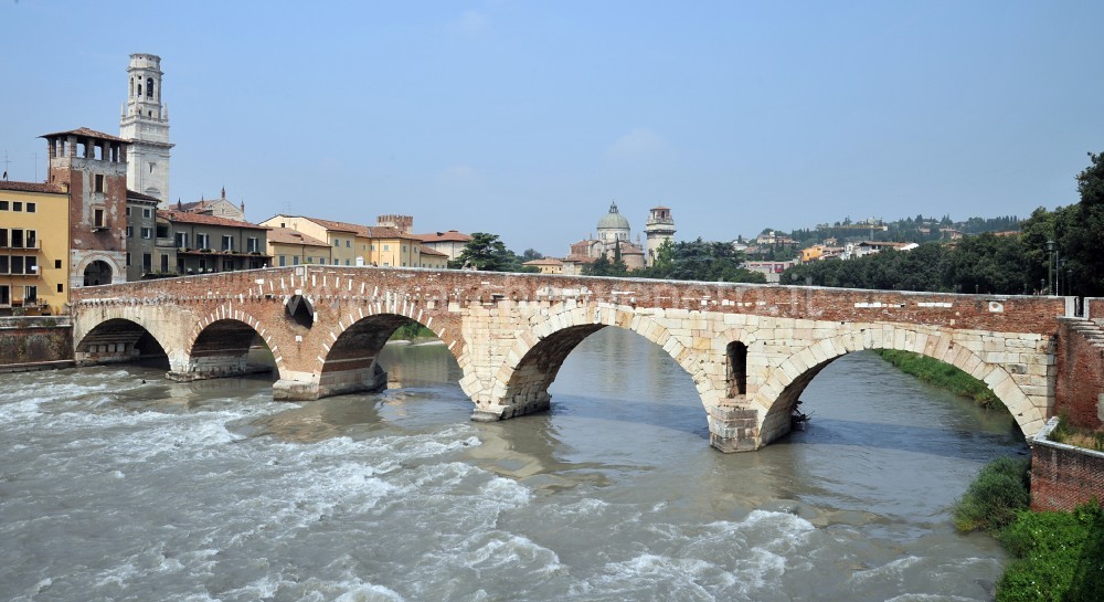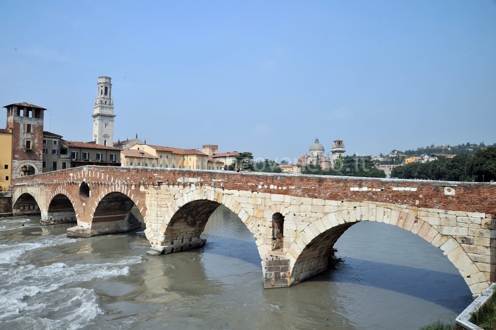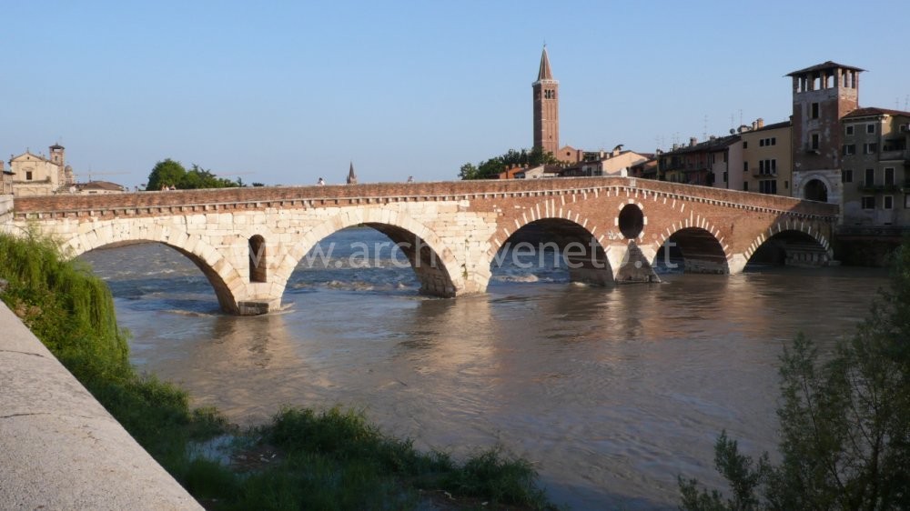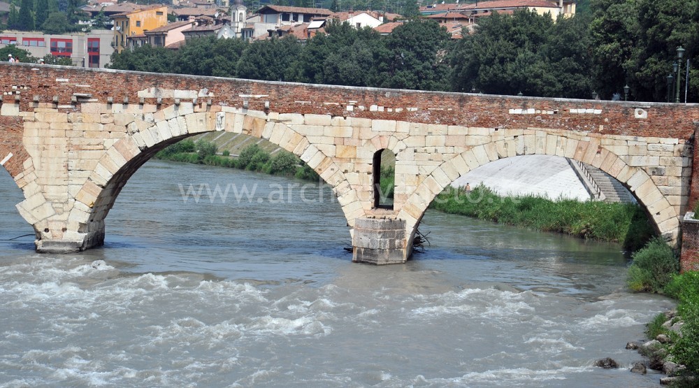 Ponte Pietra congiungeva il centro cittadino romano al quartiere del teatro ed era costituito da una sequenza di cinque arcate, delle quali ne rimangono oggi solo due, prossime alla riva sinistra dell’Adige.