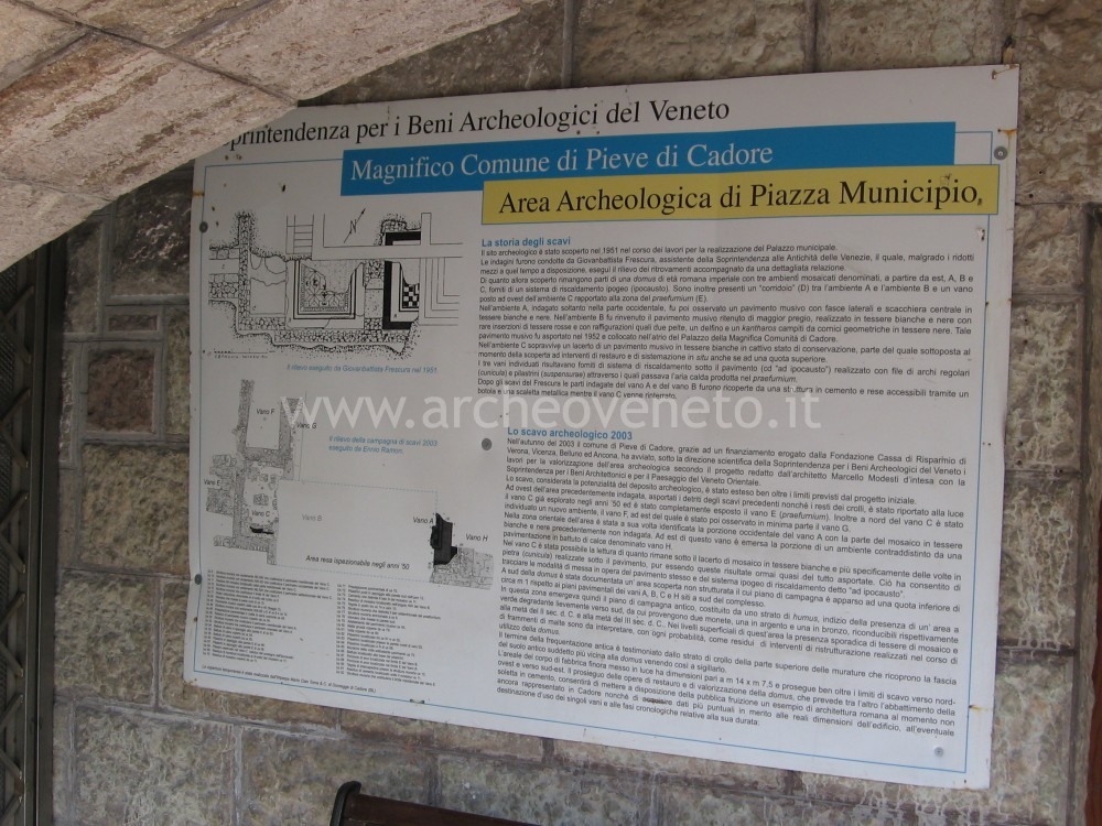 Di fronte al Municipio di Pieve di Cadore sono visibili alcune strutture pertinenti a un’abitazione romana di età imperiale. In particolare si distinguono tre ambienti provvisti di un sistema di riscaldamento sottopavimentale. Dei pavimenti originariamente rivestiti a mosaico uno è ancora visibile sul posto, mentre un altro è ora esposto presso il Palazzo della Magnifica Comunità di Cadore.