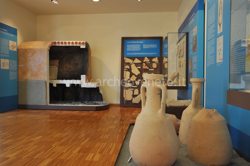 L’argomento del successivo pannello riguarda lo studio delle anfore, partendo dalla loro fabbricazione e arrivando alla definizione della loro funzione commerciale e delle diverse modalità di utilizzo. Al di sotto e a fianco del pannello sono esposte anfore vinarie e olearie intere (metà I sec. a.C.-metà I sec. d.C.) e frammenti di orli, puntali, tappi e anse di anfore provenienti dal territorio dell’Alta Padovana.