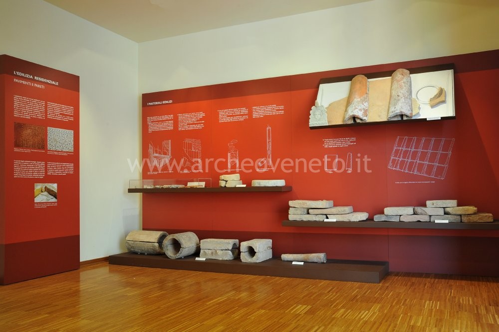 I primi riquadri che si incontrano all’ingresso della stanza, sulla sinistra, esaminano l’edilizia residenziale nei suoi multiformi aspetti: pavimenti e pareti, materiali edilizi e strutture murarie e infine coperture. Oltre al supporto pannellistico si può usufruire dell’esposizione di reperti, come tessere di mosaico, frammenti di lastre pavimentali e mattoni da colonna, ascrivibili ad un arco di tempo che va dal I sec. a.C. al II sec. d.C. La vetrina è affiancata dalla ricostruzione della composizione di un tetto con tegole, coppi e antefisse.