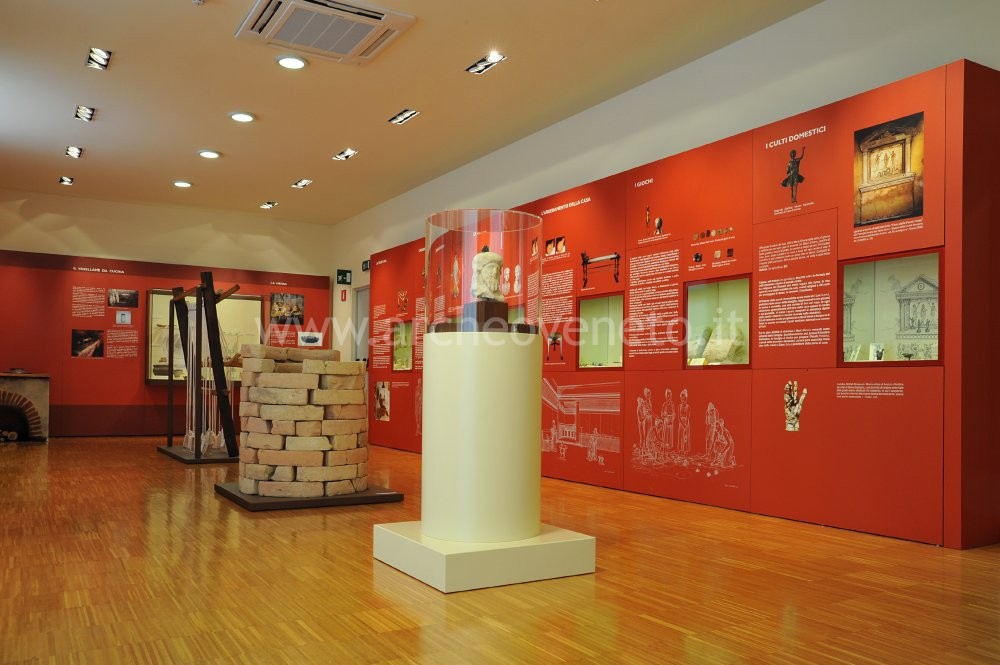 Le successive vetrine mostrano oggetti appartenenti all’arredamento della casa (applicazioni in bronzo da mobile, lucerne, chiavi di bronzo e ferro), alle attività ludiche (pedine in pasta vitrea e terracotta) e ai culti domestici (frammento di mano votiva in bronzo con serpente avvolto, frammento di colonnina in pietra pertinente ad un larario) tra I e III sec. d.C.