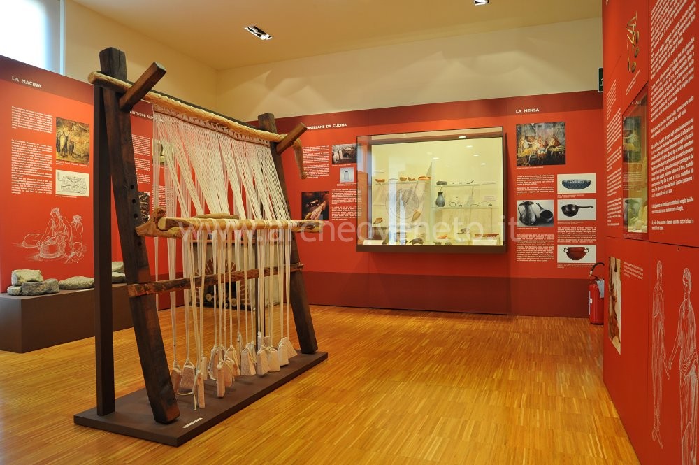 Un’altra importante attività è quella della tessitura, testimoniata da una riproduzione al centro della sala di un grande telaio verticale in legno e da una vetrina contente pesi da telaio, rocchetti e fusaiole del I sec. a.C. Intimamente connessi al tema della tessitura sono quelli dell’abbigliamento (descritto attraverso ricostruzioni grafiche e vetrine contenenti fibule in bronzo e bottoni di pasta vitrea attribuibili ad un periodo compreso tra il I sec a.C. e il III sec. d.C.) e della cosmesi (raccontato per mezzo dell’esposizione di balsamari in vetro, due strigili bronzei, perline di pasta vitrea, un anello e un paio di pinzette, tutti appartenenti alla prima età imperiale).