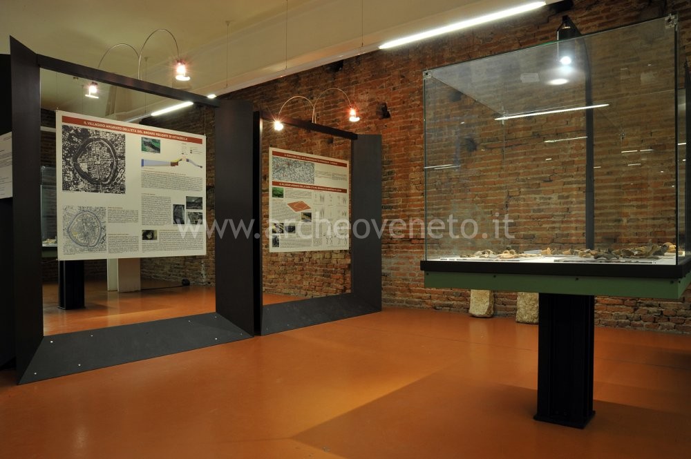 L’itinerario museale inizia con le illustrazioni dei grandi pannelli informativi posti al centro della stanza, che idealmente tripartiscono la sala nelle tre fasi cronologiche che interessarono il territorio di Cittadella: Preistoria a destra, età romana al centro e periodo medievale-moderno a sinistra. I pannelli rivolti verso destra presentano gli studi condotti sul villaggio arginato dell’età del Bronzo recente di Cittadella e quello della tarda età del Bronzo di S. Martino di Lupari. Entrambi sono esempi di cinte arginate, finalizzate alla difesa del villaggio sito all’interno.
