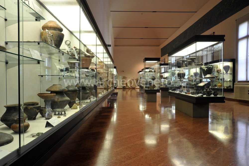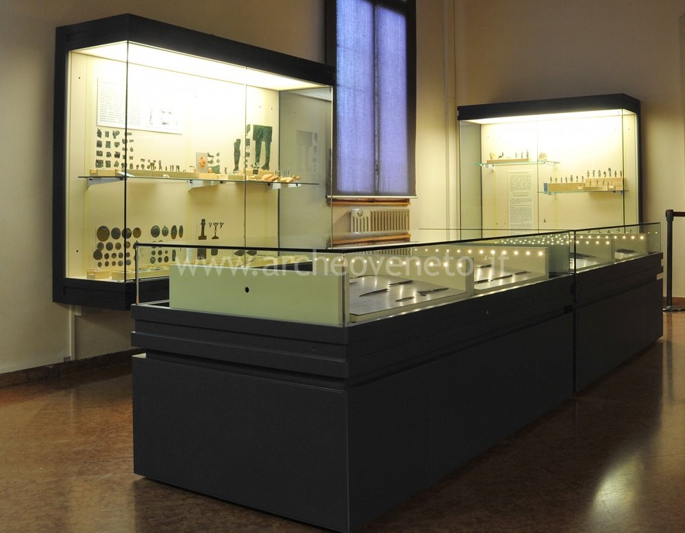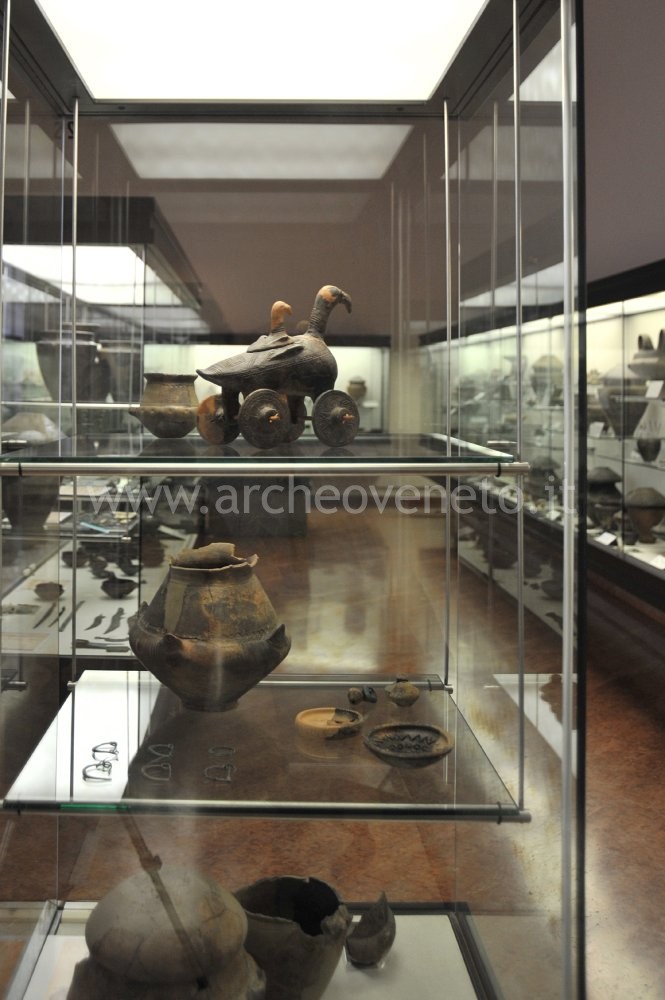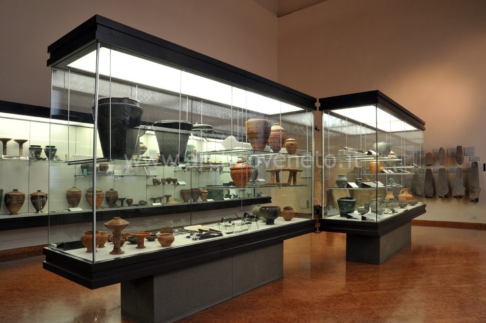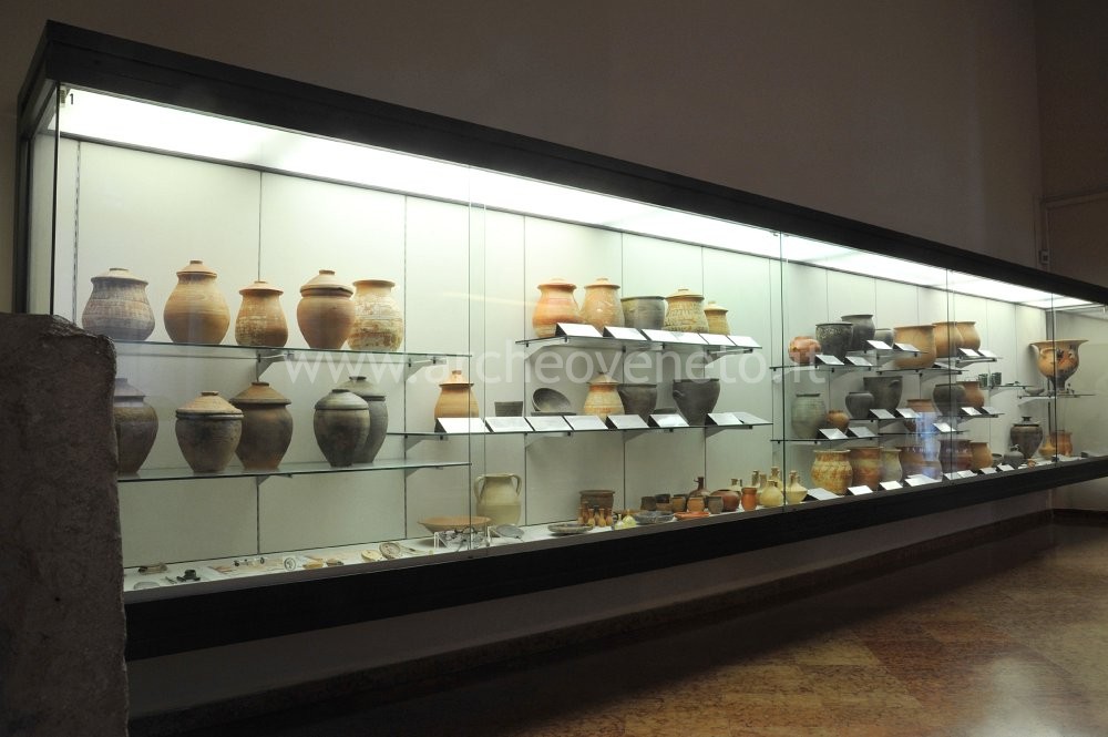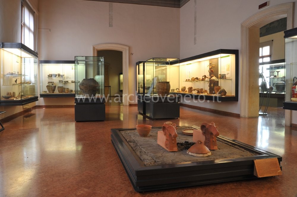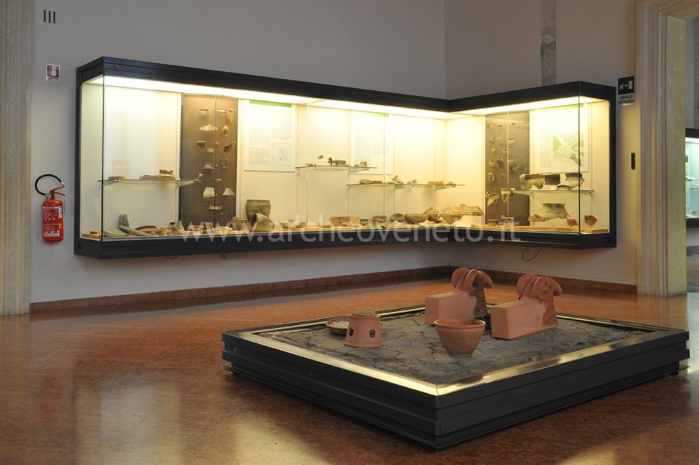 In questa sala sono esposti manufatti provenienti dall’antico centro veneto di Este e di altri insediamenti coevi sorti nell’agro atestino. L’abitato di Este-Borgo Canevedo, sorto nel Bronzo finale (XI-X sec. a.C.) in prossimità dell’antico corso dell’Adige, è documentato da vasellame di uso domestico (piatti, scodelle, tazze, olle, vasi biconici, ecc.), da manufatti in osso o corno (zappette, pettine, immanicature) e da oggetti in bronzo. Sono da riferire alle attività femminili della filatura e della tessitura le fusaiole e i pesi da telaio. Alla sfera ideologica va collegata verosimilmente la produzione plastica di piccoli animali (cavallini e bovidi).