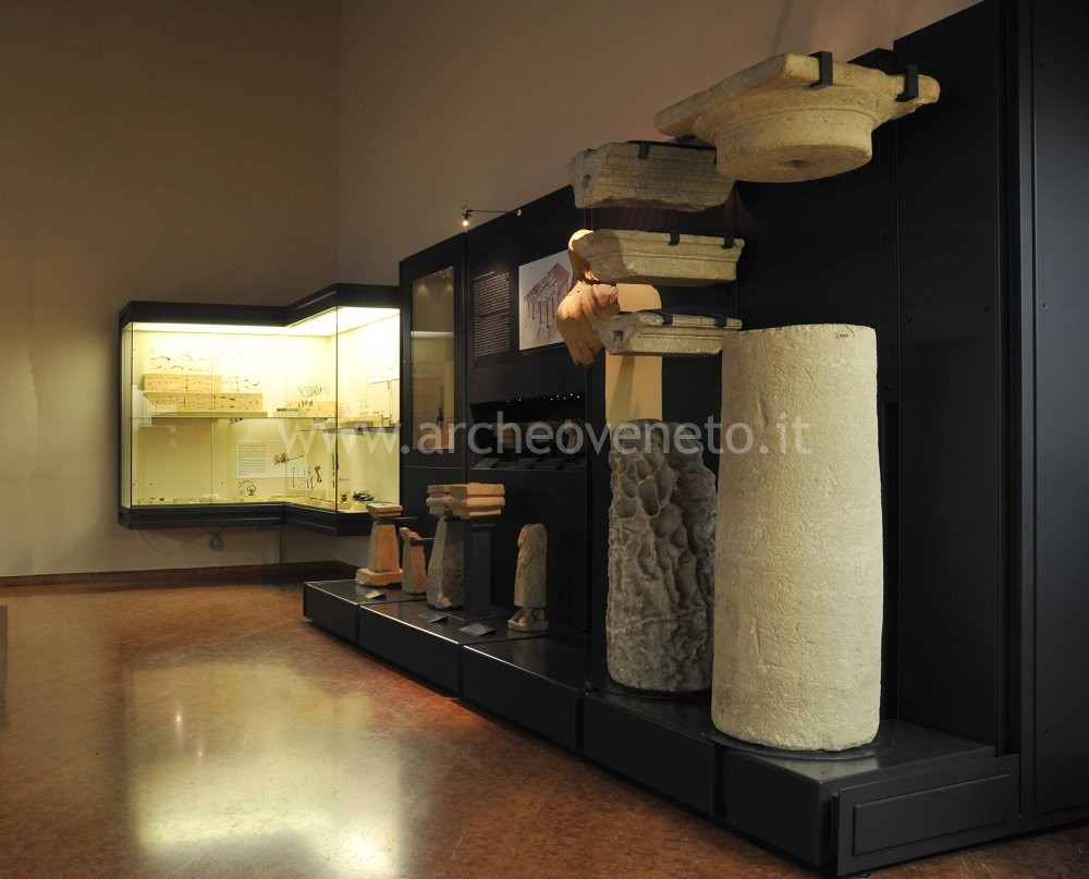 Sulla parete di fondo è stato ricostruito il fregio fittile (composto da triglifi e metope), che decorava la facciata di un tempio dedicato a una coppia divina, probabilmente i Dioscuri. Il tempio sorgeva nella zona attualmente denominata Casale, dove anticamente scorreva l’Adige. Alla più antica fase del santuario, ancora nell’età del Ferro, va riferita la piccola coppa bronzea con iscrizione venetica. Gli oggetti della stipe del tempio romano, costituiti principalmente da manufatti metallici, documentano fino al II sec. d.C. l’attività del santuario, le cui divinità presiedevano alla navigazione, al commercio, alla pesca, ma anche alla salute e alla fertilità. Un altro aspetto della vita pubblica romana è documentato dall’esposizione di monete romane di età repubblicana e imperiale, di cui si segnala il raro medaglione aureo, emissione augustea del 2 a.C.
