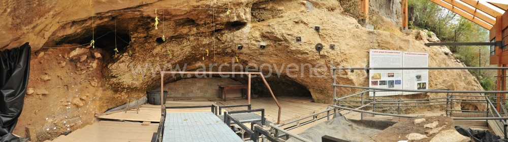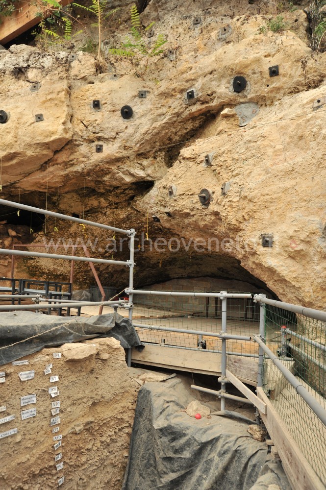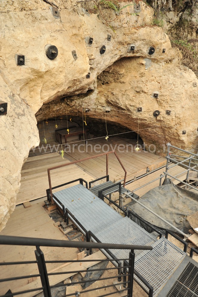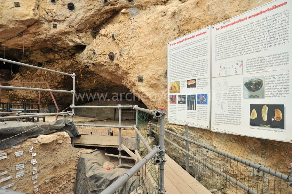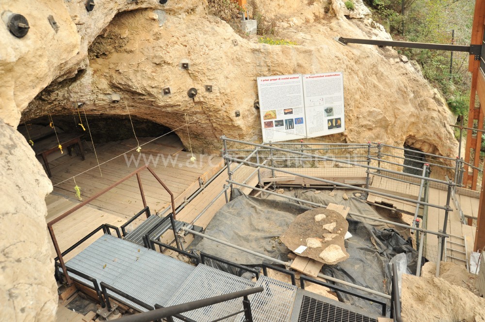 I resti più antichi, riferiti ai Neanderthaliani, sono stati indagati su superfici limitate, tra i 6 e gli 8 mq, e hanno restituito decine di migliaia di schegge di selce e di resti faunistici, in alcuni casi inglobati all’interno di suoli di abitato ben conservati. Alcune aree si distinguono per la ricchezza di resti e di strutture legate alla produzione di strumenti in selce (tecnica Levallois), al depezzamento delle prede, alla frantumazione e all’utilizzo dell’osso, all’accensione di fuochi. Le strutture di combustione poggiano direttamente sul suolo oppure sono alloggiate in piccole depressioni opportunamente predisposte: ne sono state rinvenute nove, attorniate da schegge, strumenti ritoccati, ossa di erbivori fratturate intenzionalmente. Il depezzamento delle prede, in particolare stambecchi e cervi, è testimoniato dalla grande quantità di ossa, talvolta ancora in connessione anatomica e associate a strumenti litici. L’insieme dei rinvenimenti suggerisce una economia di sussistenza basata sulla caccia.