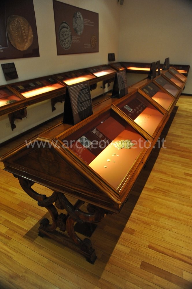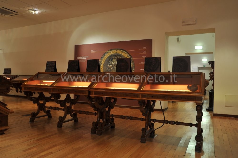 Il percorso inizia sulla destra con le prime vetrine in cui sono esposte le monete greche. Le prime sono prevalentemente oboli e tetradrammi in argento, raffiguranti la tipica civetta ateniese e ascrivibili a un arco cronologico compreso tra la fine del VI e il III sec. a.C. A questa sezione appartengono anche le monete provenienti dalle poleis della Magna Grecia e della Sicilia. È rilevante notare come ogni città-stato avesse un tipo monetale differente, che spesso si può identificare con un simbolo della città o con la rappresentazione di animali o prodotti della terra sacri a divinità. Tra le monete greche possiamo annoverare anche le emissioni di Alessandro Magno, le quali hanno avuto l’importante funzione, nel IV sec. a.C., di unificare la circolazione monetale nella penisola ellenica (statere d’oro e tetradrammi d’argento), emergendo a modello di tutte le monetazioni dei regni ellenistici successivi. Al centro della stanza sono esposti gli esemplari celtici, provenienti da diverse aree dell’Italia settentrionale (lombarda, ligure-piemontese e veneta). Tali emissioni sono fondamentali per comprendere le vicende storico-politiche che riguardarono la monetazione di queste aree tra il IV e il I sec. a.C.: i Celti, avendo combattuto come mercenari presso i grandi sovrani macedoni, Filippo II e Alessandro Magno, importarono in patria e imitarono i tipi monetali con cui erano venuti a contatto. Tra questi reperti è importante segnalare un ripostiglio trovato in via Ospedale a Padova, che raccoglie un consistente numero di dracme venetiche.