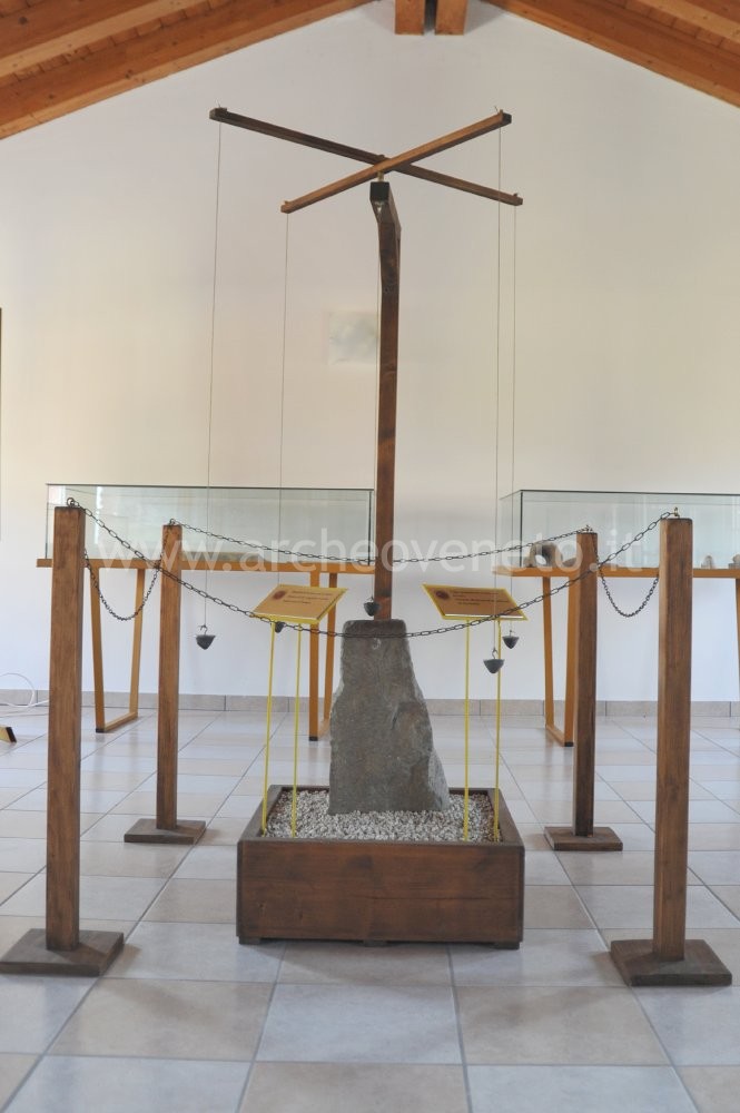Il pezzo più rilevante dell’intera esposizione è posto al centro della sala. Si tratta di un cippo gromatico di trachite con inciso sulla sommità il segno di decussis. Per esaltare l’importanza e la funzionalità di questo reperto è stata ricostruita, al di sopra dello stesso, una groma in legno sull’esempio di quella ritrovata durante gli scavi di Pompei. Oltre a ciò, si deve evidenziare la presenza di un ulteriore pannello luminoso che illustra con immagini il posizionamento e le diverse parti della groma e il procedimento per tracciare i kardines e i decumani.