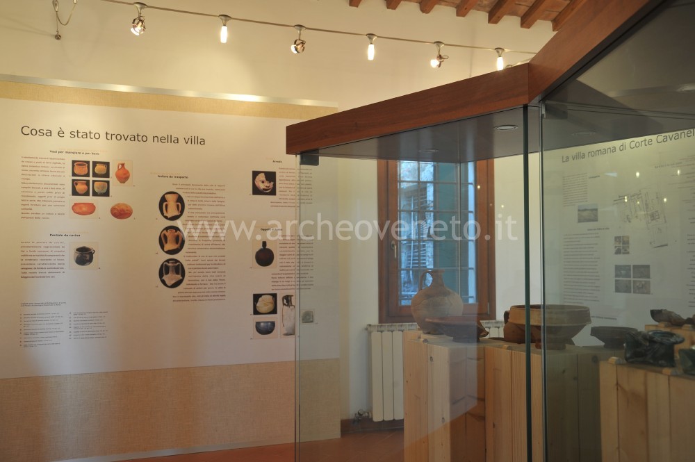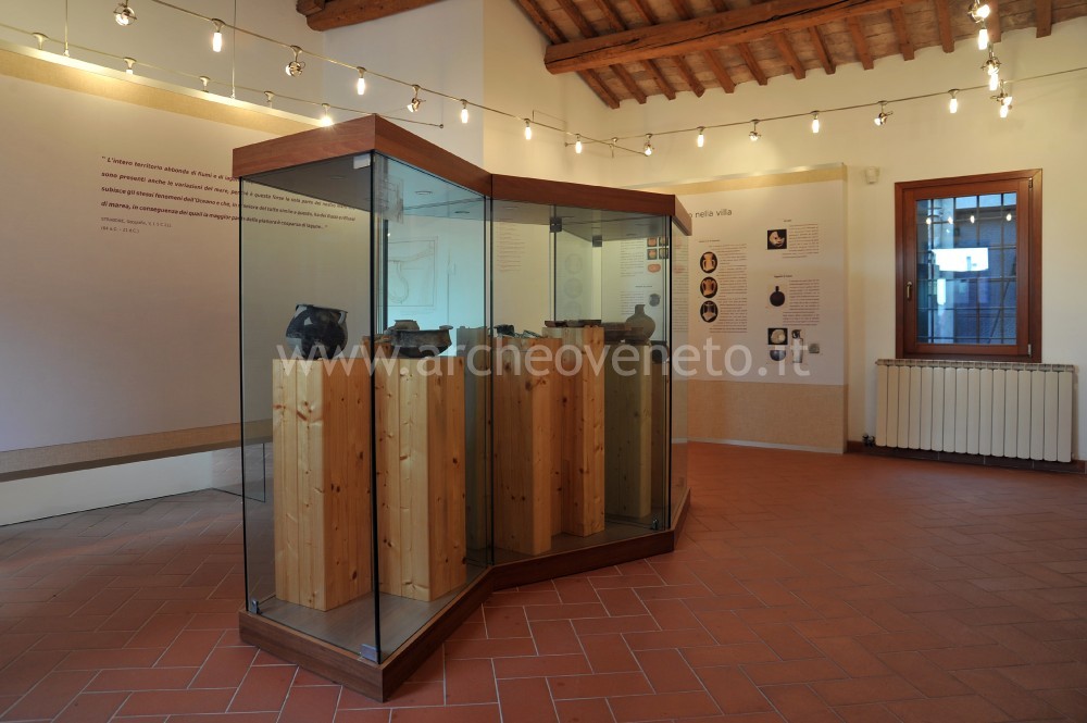I reperti contenuti all’interno delle tre vetrine consistono perlopiù in vasellame da cucina (olle a fondo convesso in ceramica comune del II sec. d.C.), oggetti di lusso (frammenti di colli e fondi di hydriai in vetro, un ago e spilloni in osso lavorato), vasellame da mensa (coppette e piatti in ceramica sigillata norditalica e boccali in ceramica a pareti sottili) e oggetti d’arredo della villa (lucerne di tipo "Firmalampen").