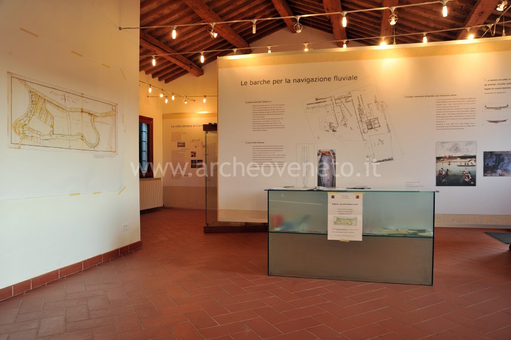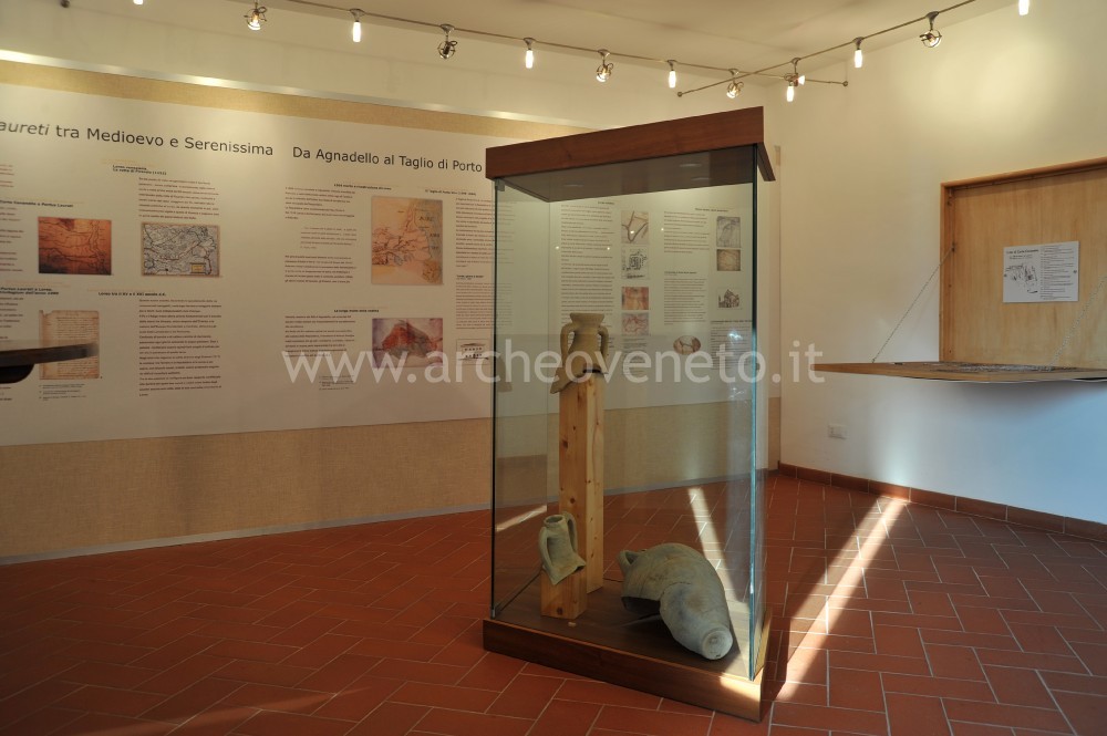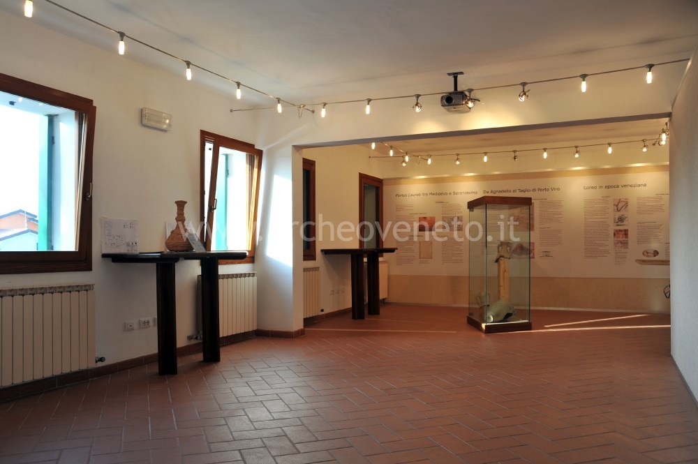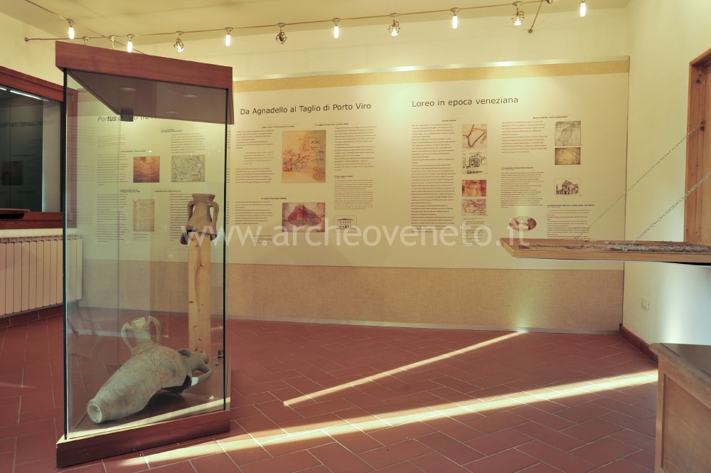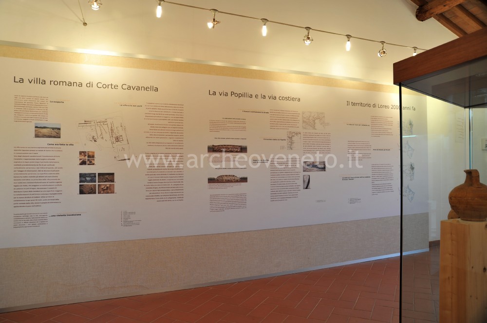 Nella prima sala, dotata di quattro grandi pannelli che illustrano la storia del territorio di Loreo, si trovano tre vetrine contenenti i reperti di età romana rinvenuti nei pressi dell’insediamento rustico di Corte Cavanella. La grande villa romana doveva sorgere su una barena sopraelevata, all’interno di uno specchio lagunare, presso un canale che la metteva in comunicazione con il mare. La particolare posizione influenzò le tecniche di costruzione, volte a consolidare il terreno, e la durata della struttura, che fu usata dall'inizio del I sec. d.C. all'inizio del V sec. d.C. La sua importanza è da accostare a questa specifica ubicazione, che le permise di diventare un punto strategico di snodi commerciali sia marittimo-fluviali che terrestri. E’ possibile infatti identificare questa villa con la Mansio Fossis citata dagli itinerari antichi, una stazione di sosta sita lungo la prosecuzione della via Popilia verso nord.