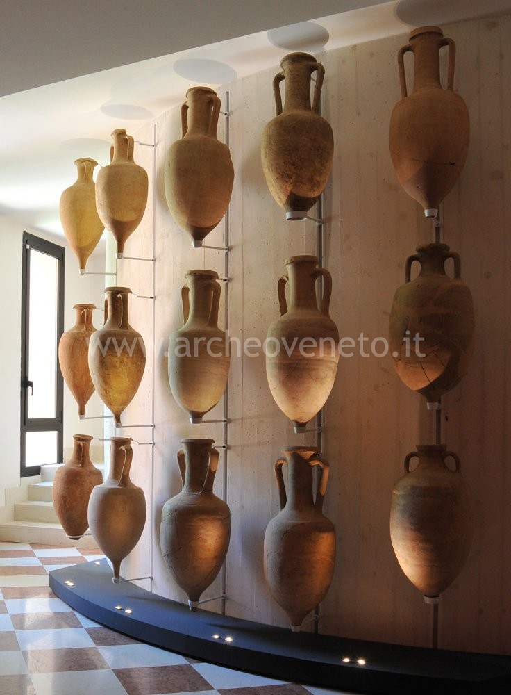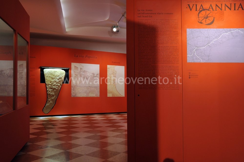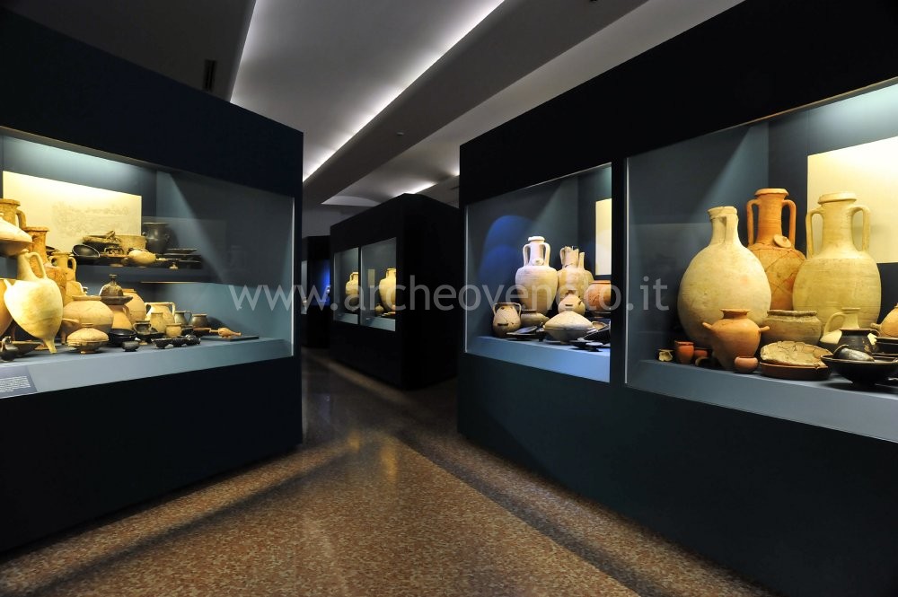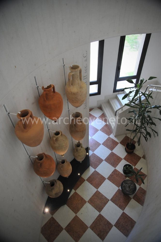Scendendo le scale che conducono al piano rialzato si è accompagnati da una esposizione di anfore che documentano il passaggio all’epoca della romanizzazione, momento in cui in città si affaccia un ulteriore interlocutore, quello romano, ad aumentare la caratteristica già multietnica dell’insediamento. I romani che arrivano ad Adria si confrontano con gli ultimi abitanti ancora legati al mondo e al costume etrusco, ai quali si devono riferire le sepolture collocate nelle vetrine sul lato sinistro della sala. Sono corredi ancora connotati da una certa ricchezza, che testimoniano di una vivacità di importazioni ed influssi. La città nel frattempo si dota di un apparato monumentale che, se pur in modo lacunoso, traspare dalla bella testa fittile femminile velata e, ancor più, dal frammento di statua femminile panneggiata in terracotta che documenta l’esistenza di un monumento con decorazione frontonale, sulla scorta di quanto avveniva nello stesso periodo ad Aquileia e probabilmente anche in altre città del Veneto antico. Questa svolta nell’arredo urbano è il risultato del contatto con il mondo romano-italico, favorito dalla stesura di una efficace rete stradale che, nel corso della seconda metà del II sec. a.C., arricchisce i percorsi veneti. Ad Adria fanno capo due importanti direttrici stradali che collegano il mondo etrusco padano e costiero con il Veneto e il settentrione: la via Popillia, documentata dal miliare del console Popillio Lenate rinvenuto in città, nei pressi della chiesa della Tomba, ancora nella sua posizione originaria, e la via Annia, che collegava la città con Padova e quindi con Altino, Concordia e Aquileia; a questa strada è dedicata anche la stazione multimediale. Dall’angolo nord-ovest della sala si accede alla sala della ‘Tomba della biga’ che è qui possibile vedere da vicino, mentre nella sala il percorso prosegue con le prime sepolture che tra II e I sec. a.C. testimoniano del cambiamento del costume funerario dovuto all’arrivo dei romani. Viene abbandonato il rito dell’inumazione in favore dell’incinerazione; le sepolture testimoniano ancora contatti di carattere commerciale come nel caso della bella coppa di vetro di produzione orientale (siro-palestinese) e in quello della brocca fittile a testa negroide. Nell’angolo compaiono le prime attestazioni numismatiche che introducono verso la città di epoca imperiale.