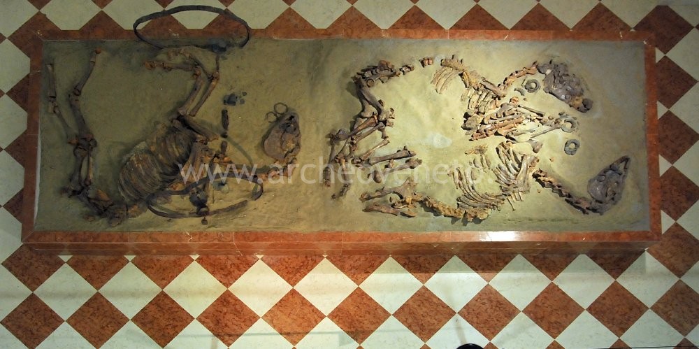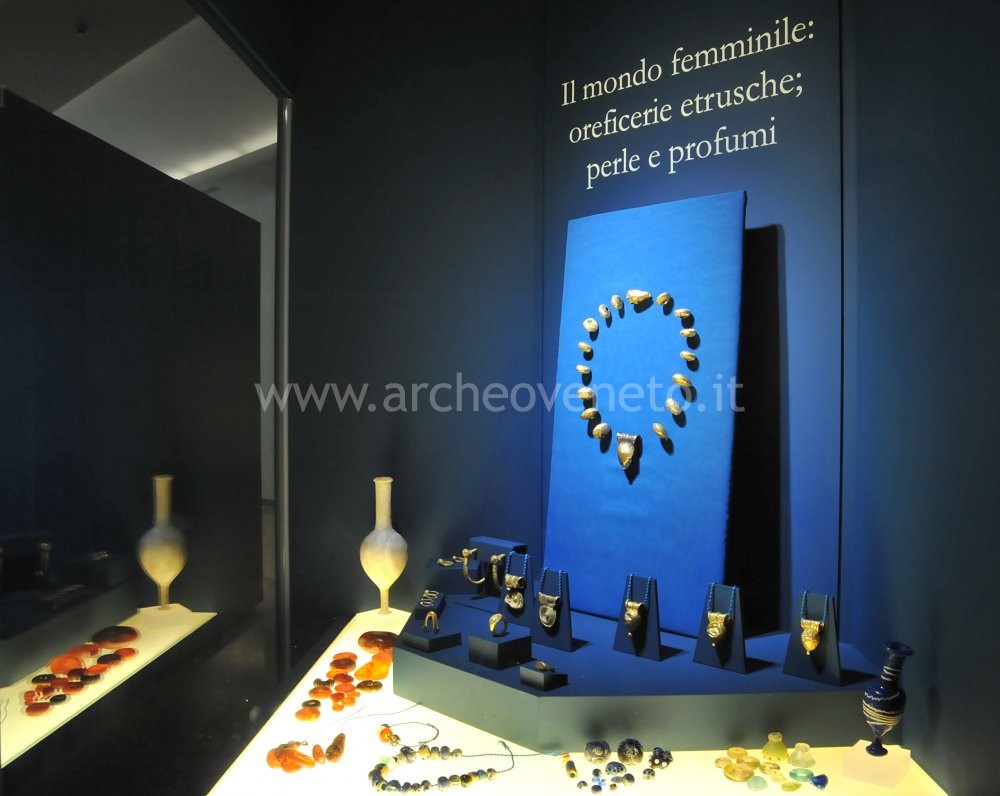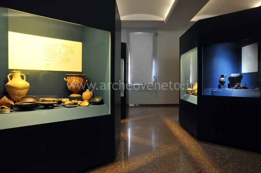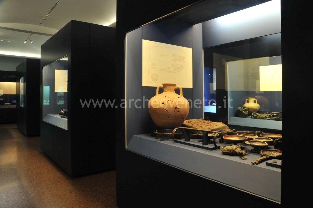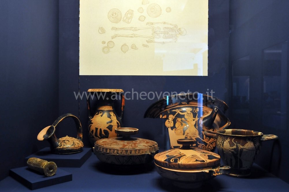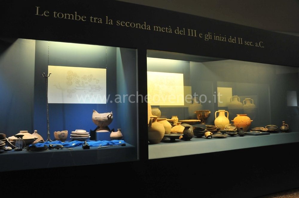 Sono esposti in questa sezione i più rilevanti corredi funerari dell’epoca arcaica e classica, tra il VI e il V sec. a.C. dai quali si può ricostruire il rituale destinato alla sepoltura, sia ad inumazione che ad incinerazione. I corredi sono caratterizzati fin dall’inizio da materiali e costumi di provenienza diversa, dall’influsso veneto evidente in alcuni dolii ed olle in ceramica locale, a quello greco e mediterraneo che traspare dagli elementi da banchetto in ceramica di importazione e dalla ricchezza dei balsamari vitrei policromi, a quello etrusco, più evidente negli oggetti di bronzo e di ferro per i prestigiosi servizi da mensa per il vino, oltre che per la cottura e il consumo della carne. Ben si distinguono i corredi maschili, in cui gli elementi della celebrazione del banchetto sono molto ricchi ed evidenti, così i set formati da coltelli, alari e spiedi in ferro, oltre che dalle brocche e dai contenitori in bronzo. I corredi femminili, seppur con l’ausilio di altre categorie di oggetti, risultano altrettanto ricchi. Si possono ammirare lungo il percorso gioielli in ambra, pasta vitrea, oro, argento, bronzo e preziosi balsamari in vetro. Anche nel IV secolo a.C. non mancano le sepolture di rango, tuttavia con la crisi della produzione ateniese verso la fine di questo secolo inizia a scomparire progressivamente la ceramica d’importazione greca.