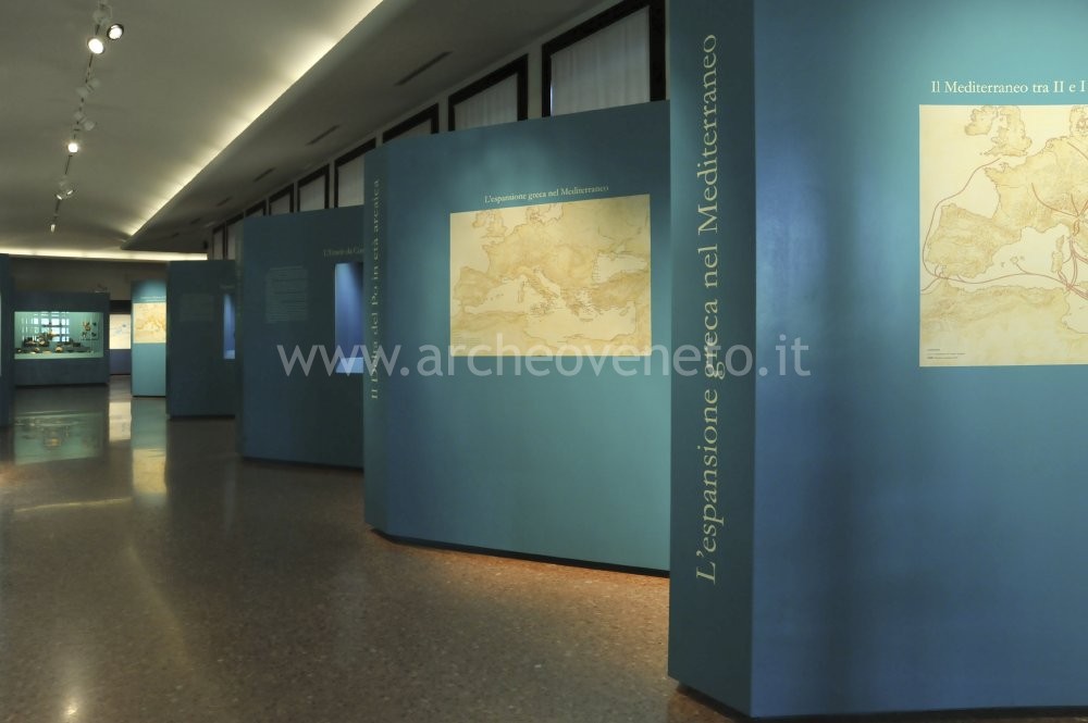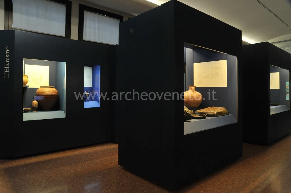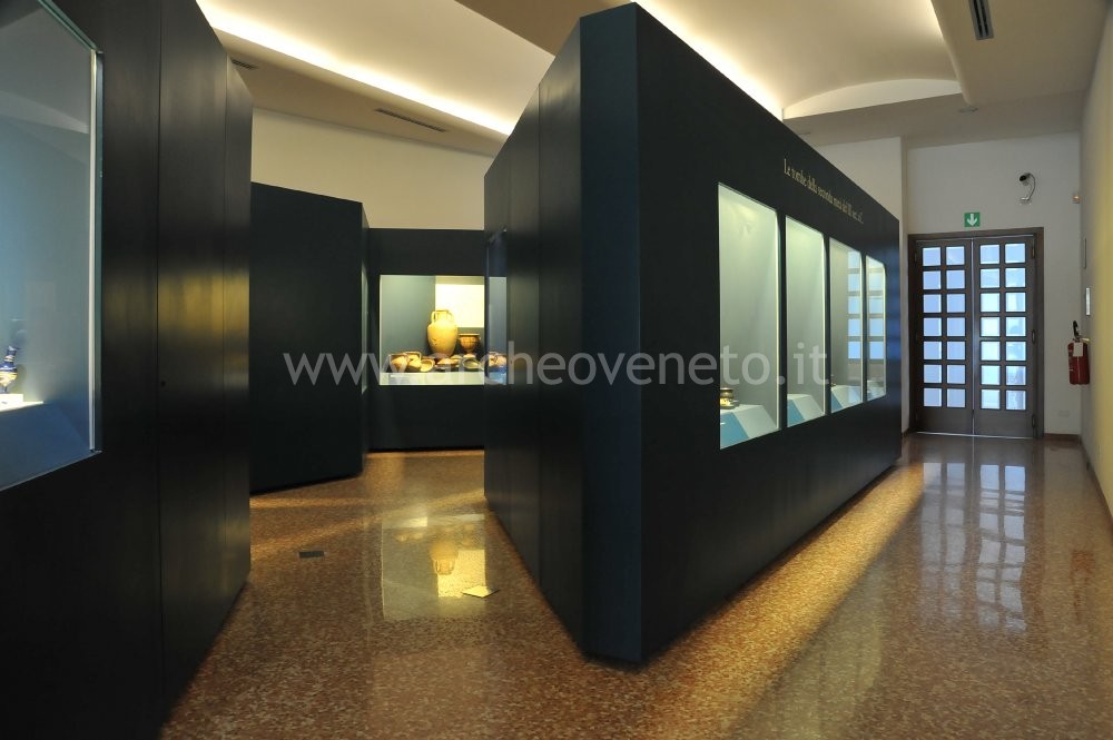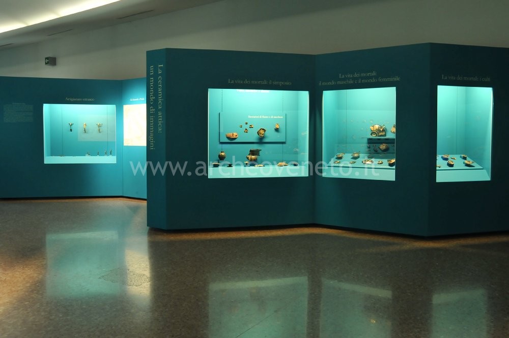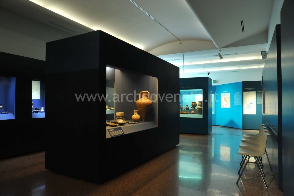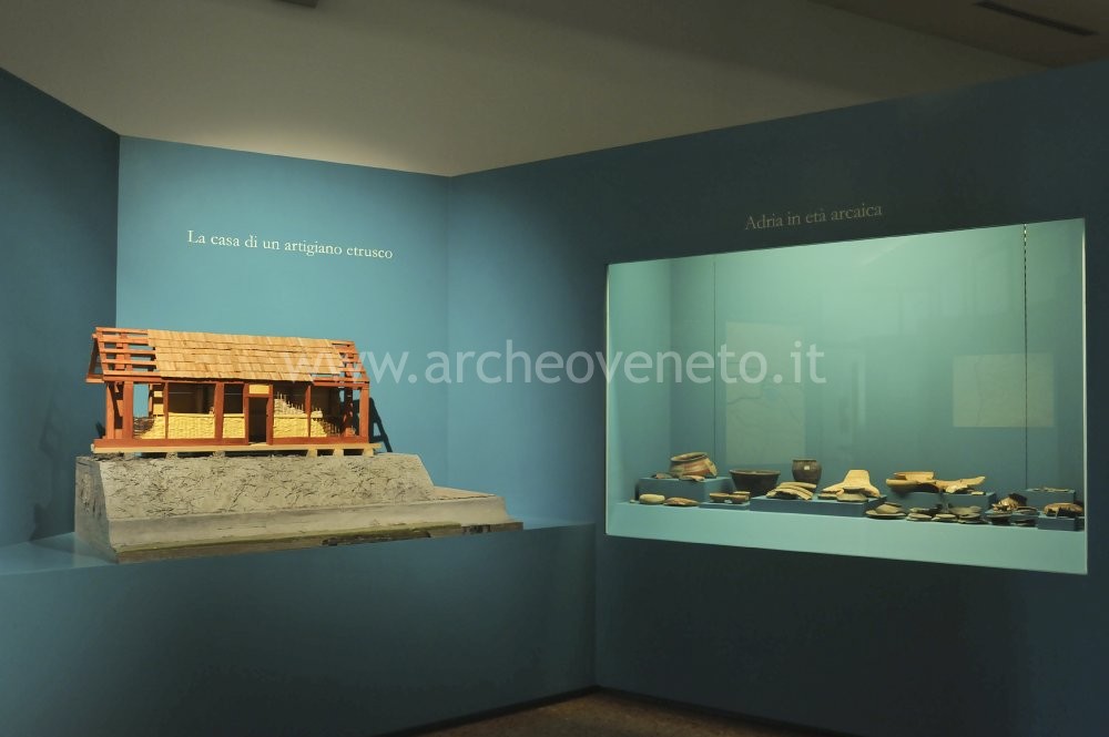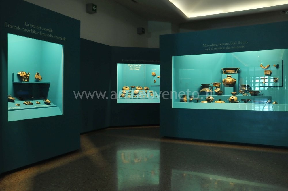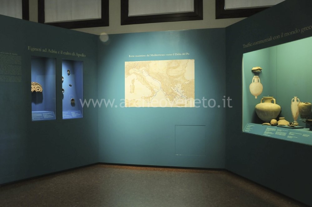 Nella sezione turchese sono esposti oggetti che provengono dai centri abitati del territorio dell’antico Delta del Po e da Adria. Vi si trovano frammenti dell’età del Bronzo medio-recente, a documentare i più antichi momenti della presenza umana, e le prime importazioni che attestano l’arrivo di genti straniere alla ricerca di contatti commerciali. Un esempio importante è la capanna scoperta in via Amolaretta ad Adria, datata all’età del Bronzo medio e recente (XIV e il XII secolo a.C.). Inerenti questo sito sono esposti oggetti che raccontano le attività quotidiane, quali la caccia e la lavorazione delle materie prime animali, e manufatti che, grazie alle loro peculiari caratteristiche, testimoniano i contatti commerciali regionali ed extra regionali di quest’area. Da Contarina proviene poi un bronzetto raffigurante un Eracle cacciatore, di produzione, probabilmente, etrusco meridionale. Le importazioni nel territorio dal mondo greco, da quello etrusco e dall’Adriatico meridionale sono ricche, nelle vetrine si possono vedere, ad esempio, numerose ceramiche dipinte. Segue un'esposizione che illustra le caratteristiche del centro abitato di San Basilio di Ariano Polesine, insediamento costiero dove, fin dagli inizi del VI sec. a.C. si coglie la compresenza di genti venete, etrusche e greche in relazione ad un punto di approdo e di scambio trategici. La medesima commistione multietnica è documentata progressivamente ad Adria, dove si sviluppa un centro in cui le abitazioni, costruite con una intelaiatura di legno e frasche rivestita di terra, si impostano sopra opere di bonifica necessarie a garantire un ambiente asciutto, come testimonia un plastico ricostruttivo. Oggetti di importazione, come le ceramiche e le decorazioni architettoniche, oltre alle iscrizioni greche ed etrusche, lasciano intravvedere la vivace attività di una città che è innanzitutto centro portuale. Seguono le vetrine dedicate all’esposizione della ricca collezione di ceramiche attiche a figure nere e a figure rosse, suddivise per temi. I frammenti ceramici sono raggruppati in base alla tecnologia e alla forma oltre che alle figurazioni che riportano: sulla destra prevalentemente le vetrine che illustrano la tecnologia e particolari morfologie, sulla sinistra quelle dedicate all’iconografia: il mondo maschile e femminile, il simposio, il mito, gli eroi e le divinità, tra cui Eracle e Dioniso ecc. Pur essendo molto frammentari, questi reperti sono spesso opera dei più famosi pittori ateniesi che decorarono un vasellame prestigioso, di grande raffinatezza.