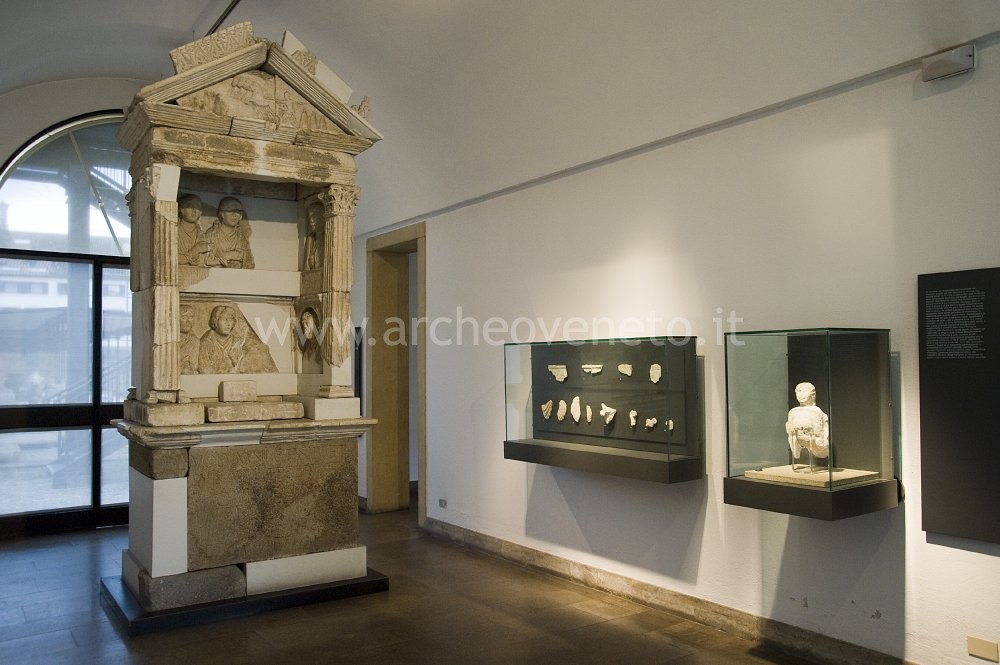 L’ultima saletta riservata alla collezione romana è dedicata all’importantissimo monumento funerario dei Volumnii (età augustea), rinvenuto in stato frammentario in una frazione di S. Pietro in Viminario, presso Monselice e ad altri ritrovamenti funerari rinvenuti nel territorio al sud di Padova. Il restauro realizzato negli anni ’80 ha permesso di ricomporre l’opera: il monumento è costituito da un alto podio (dove corre l’iscrizione votiva dei committenti e al cui interno erano contenuti i loro resti) su cui si innesta un’edicola calcarea recante i ritratti dei 10 defunti, di cui 2 andati perduti. Le iscrizioni sottostanti ad ogni personaggio hanno aiutato a identificare i busti scolpiti nel lato sinistro come non appartenenti alla gens Volumnia. Questa deduzione contrasta con la scritta sottostante (hoc monumentum heredem non sequetur), che esclude la sistemazione di estranei in questo contesto commemorativo. Al centro del timpano sovrastante è raffigurata una quadriga in corsa verso sinistra. Il monumento si pone come espressione di diversi stili architettonici, afferenti sia alla tradizione medio-italica (lastre con busti ritratto dei defunti) sia a quella microasiatica e attica (naiskoi).